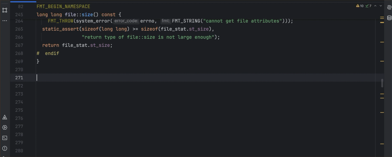 更新后的 JetBrains AI Assistant 插件配备了我们内部训练的 C++ 大语言模型,使 CLion 的云代码补全更快、更智能。 现在,它提供了更广泛的使用场景,增强的后缀匹配可以确保预测的代码段正确补全现有代码。