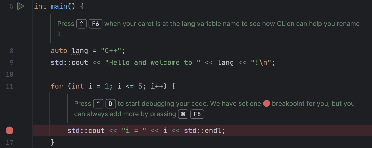 如果您刚刚开始使用 CLion,您会注意到改进的入门提示。 它们向您展示了如何使用 IDE 的一些关键功能,让您从一开始就更清楚地了解其功能。 这将缩短熟练使用 CLion 所需的时间。
