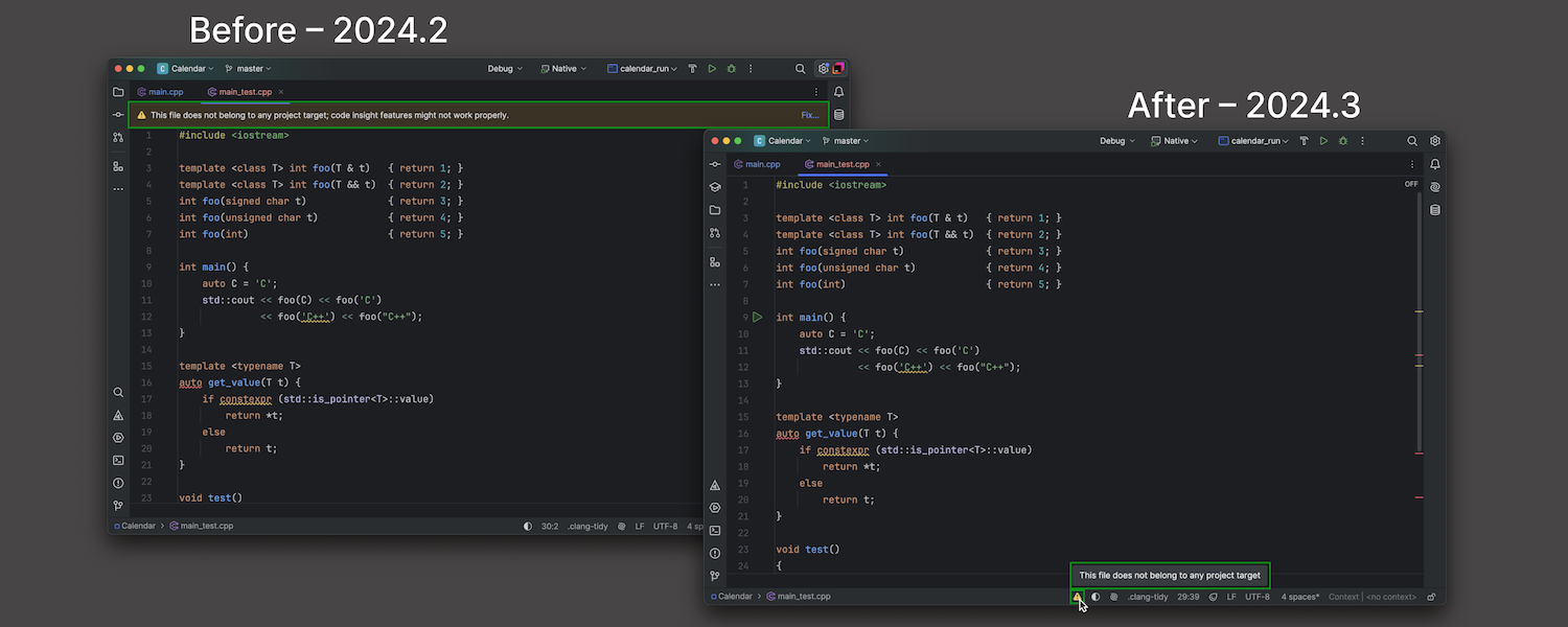 我们更快的新语言引擎 CLion Nova 现在是新用户的默认选项。 在这个版本中,我们实现了一些呼声最高的功能并修正了多个主要 bug。 最终,我们计划让 CLion Nova 成为所有新老用户的默认引擎。 但首先,我们想知道您对此是否有任何疑虑。