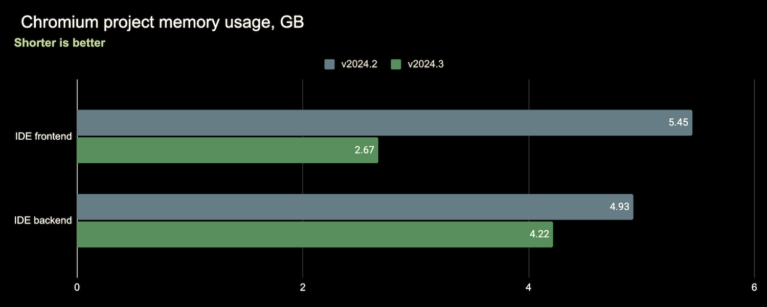 我们对 CLion Nova 做出了许多改进,以减少其内存占用。 这在大型项目中尤其明显。 将 CLion Nova 2024.2 中的 Chromium 项目与 2024.3 中的同一项目的内存使用情况进行比较,在新版本中,IDE 前端使用的内存减少了 51%,而 IDE 后端使用的内存减少了 15%。