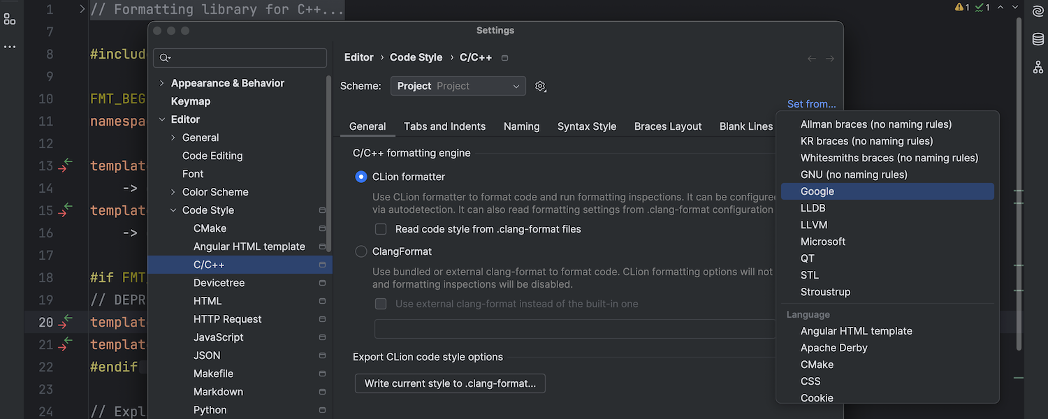 现在,您可以通过 Settings | Editor | Code Style | C/C++ | Set from…(设置 | 编辑器 | 代码样式 | C/C++ | 设置自…)选择预定义的代码样式,如 LLVM、Google、Qt 或 GNU。