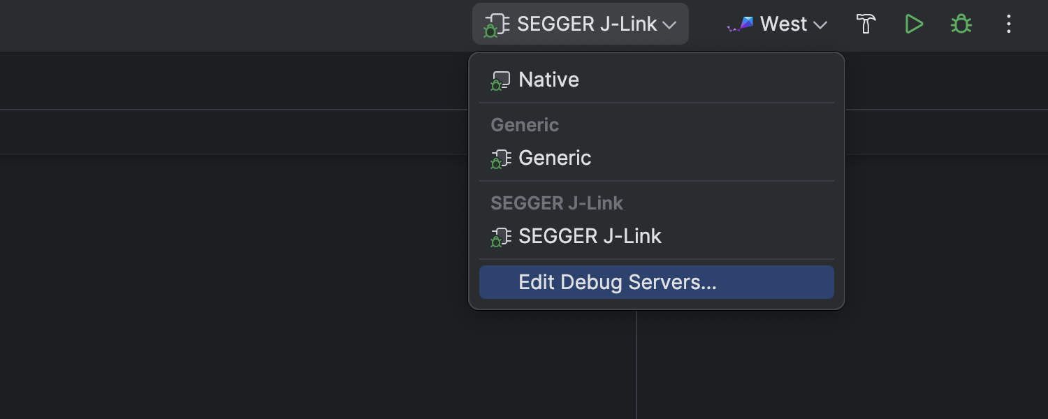 导入 Zephyr West 项目时,West 运行/调试配置会在 Run/Debug Configurations(运行/调试配置)切换器中自动创建。 您还可以通过主菜单中的 Run | Edit Configurations…(运行 | 编辑配置…)创建新的运行/调试配置。