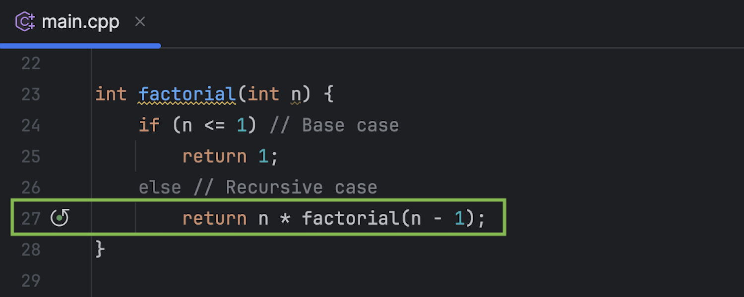 我们在装订区域中为递归调用添加了一个图标。 这可以让您更轻松地查看代码中使用递归函数的位置,并避免堆栈溢出等潜在有害情况。 图标也会显示在调用层次结构中。
