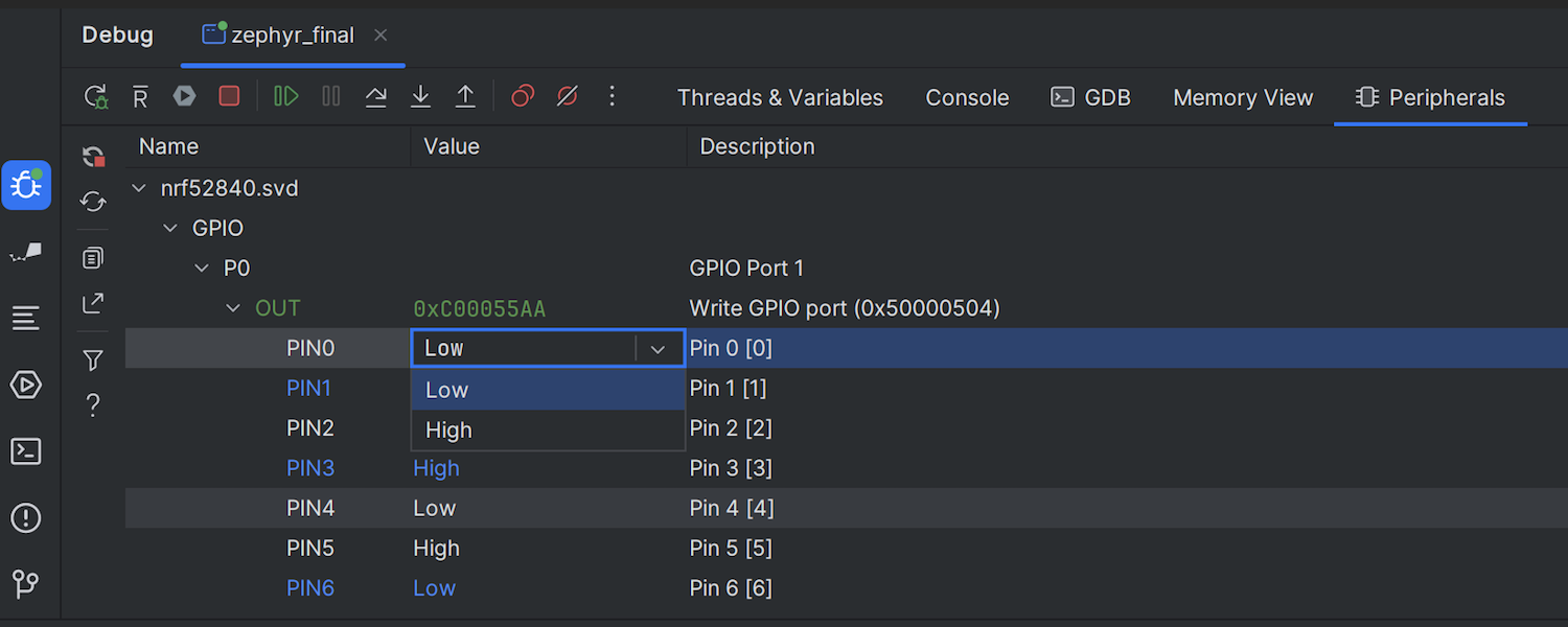 调试 GPIO 引脚或计时器等开发板外设时,您现在可以在 Debug(调试)工具窗口的 Peripherals(外设)窗格中编辑外设寄存器,立即看到更改的效果。