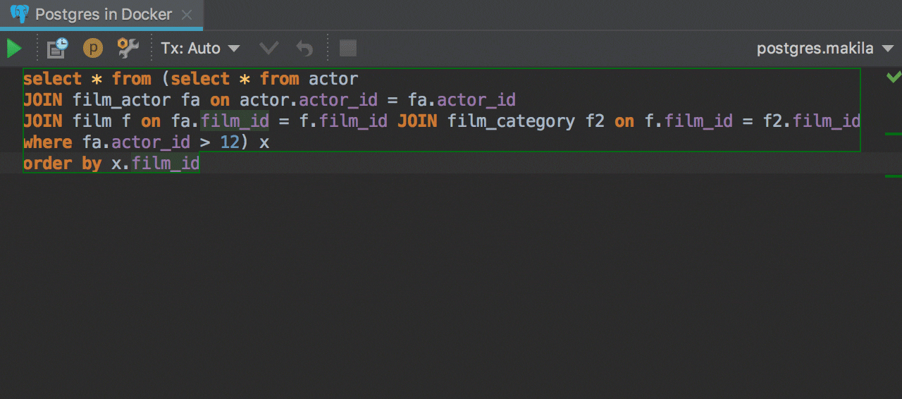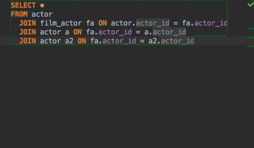 按下 Ctrl+W 可以开启语法智能选择。 首先,它会选中 脱字符号下面的单词。 再次按下,DataGrip 将分析正在编辑的代码,同时 选择会智能扩展。 这是选择特定子句或子查询的 最快方式。 要反向选择,按下 Ctrl+Shift+W,当前 选择将收缩。