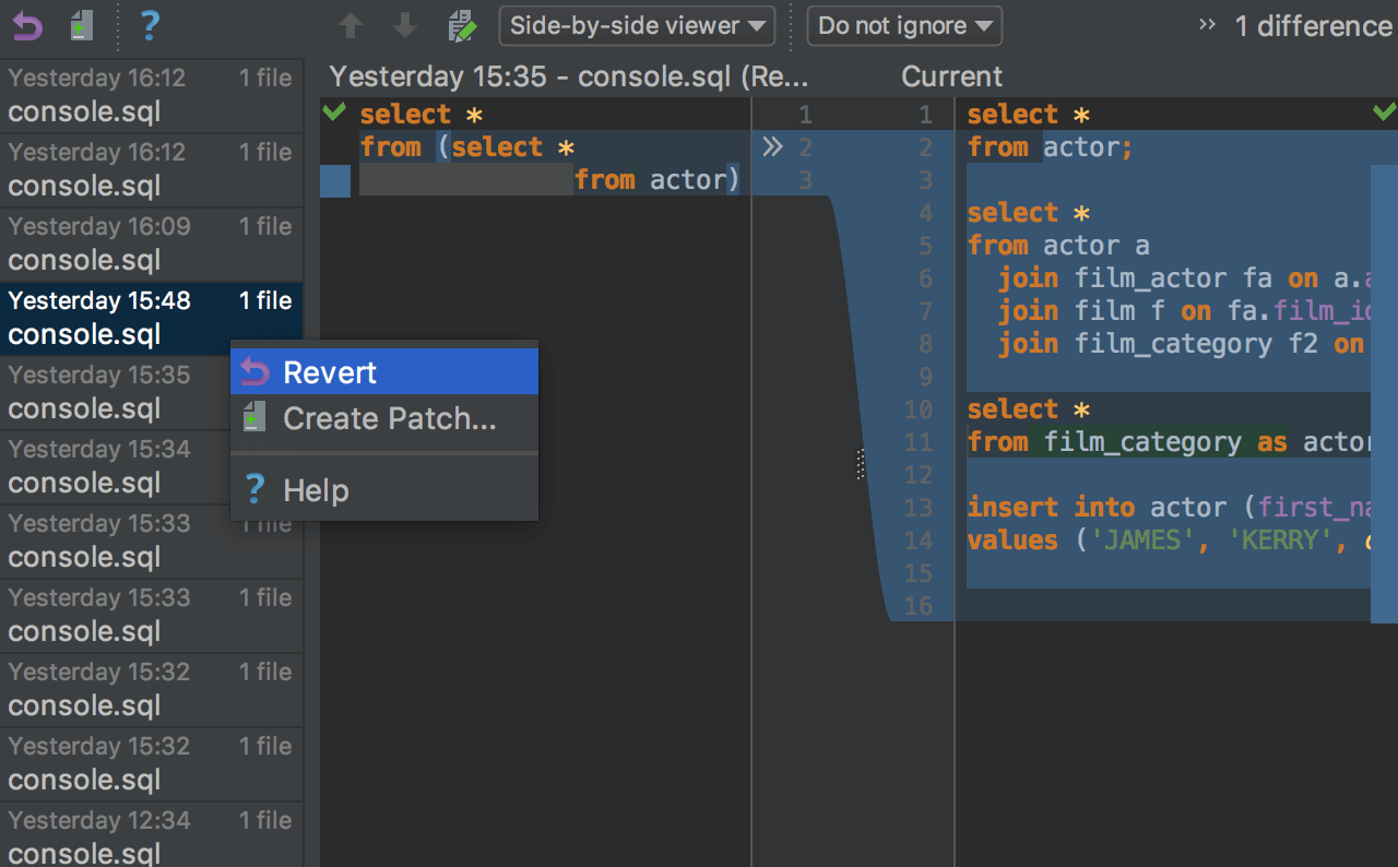 每个控制台或文件都有本地历史,这样永远都不会丢失代码。 DataGrip 可以跟踪 源文件中做出的更改,即便是由其他应用程序做的改动,也可以避免 意外丢失或修改。 您可以随时检查特定文件或目录的 历史记录。 在差异查看器中比较 更改,并还原至您需要的版本。