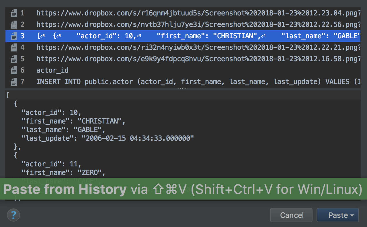 通过 DataGrip,您可以访问剪贴板历史记录,并快速粘贴最近复制到 剪贴板中的项。 当您启动应用程序时,DataGrip 会开始将复制的项记录到 它的剪贴板历史记录中,并且在关闭应用程序时清除历史记录。 按下 Ctrl+Shift+V 可以调用该功能。