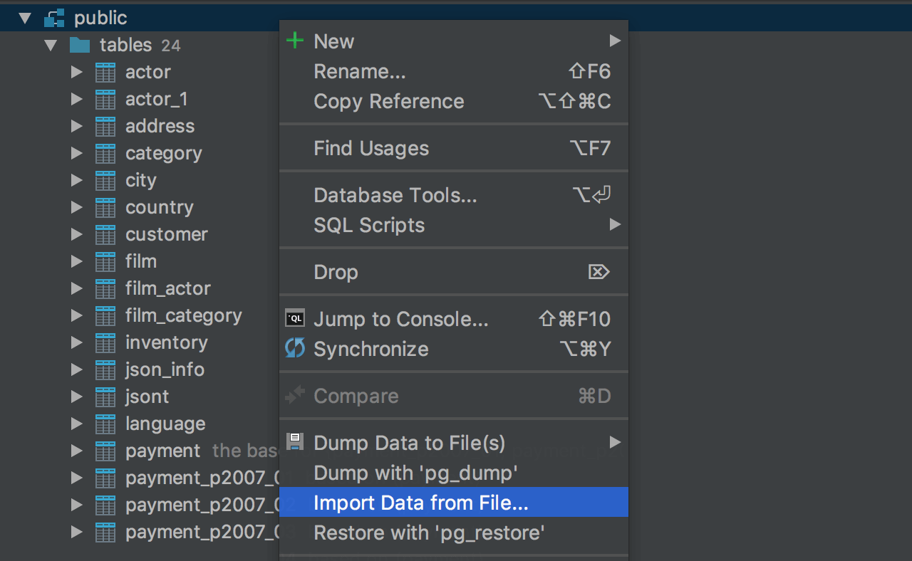 有一个专门用来将 DSV(CSV 或 TSV)文件导入至数据库的 UI。 点击想要导入数据的架构,然后从上下文菜单中选择 Import From File… 。 然后选择存储数据的 CSV 文件。