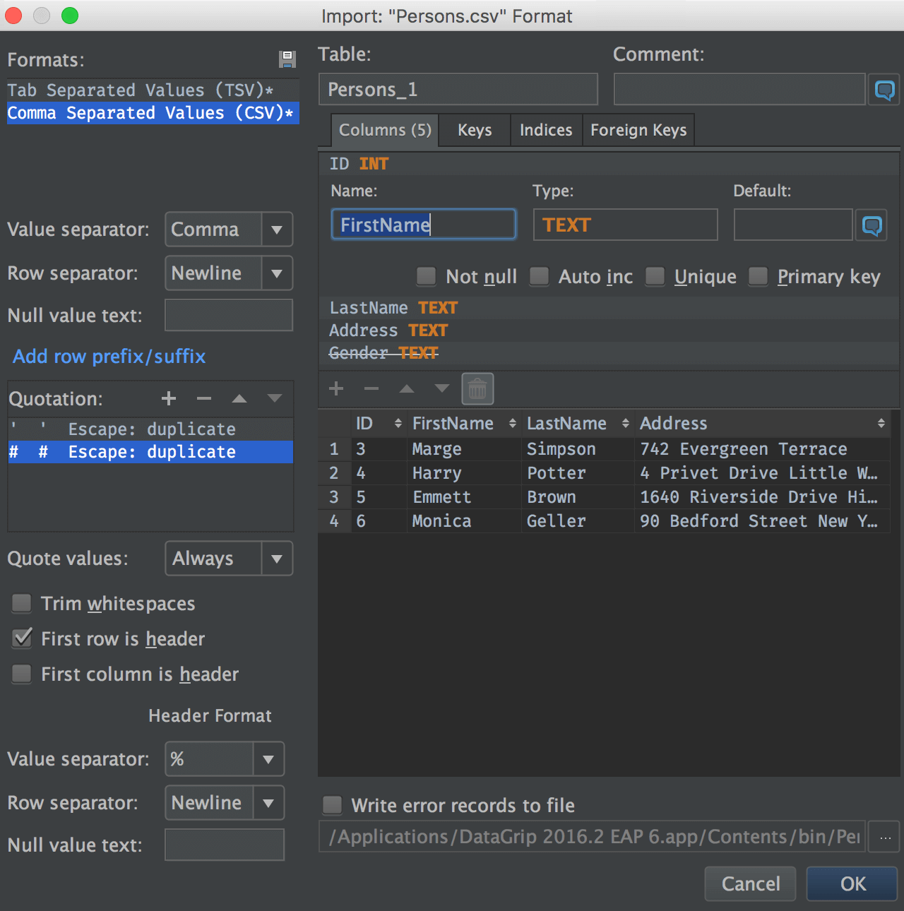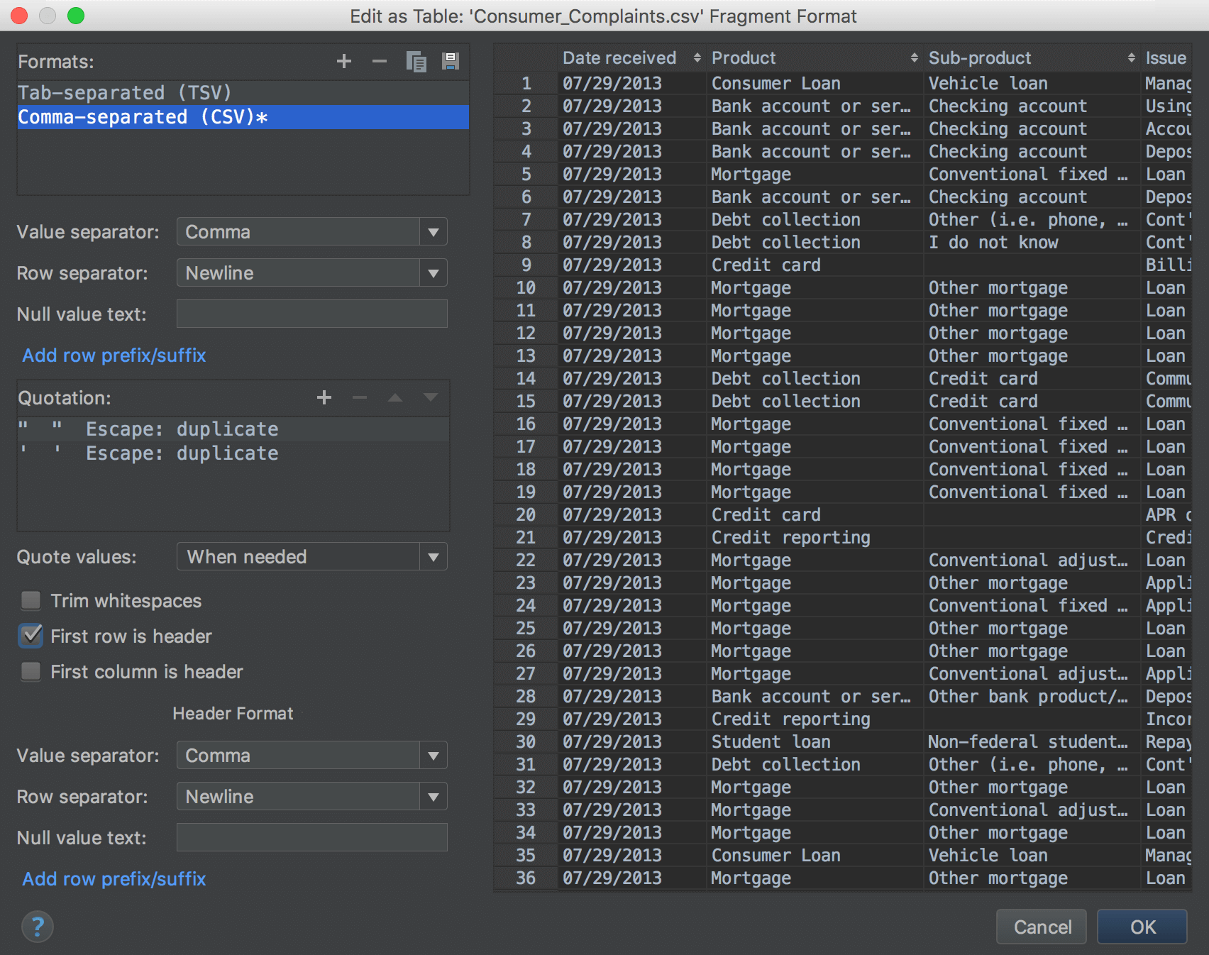 您将看到导入对话框窗口。 左边的面板显示了格式规格:如果第一行是页眉(它有单独的格式选项),那么请选择分隔符,并指定你是否在文件中引述了值。