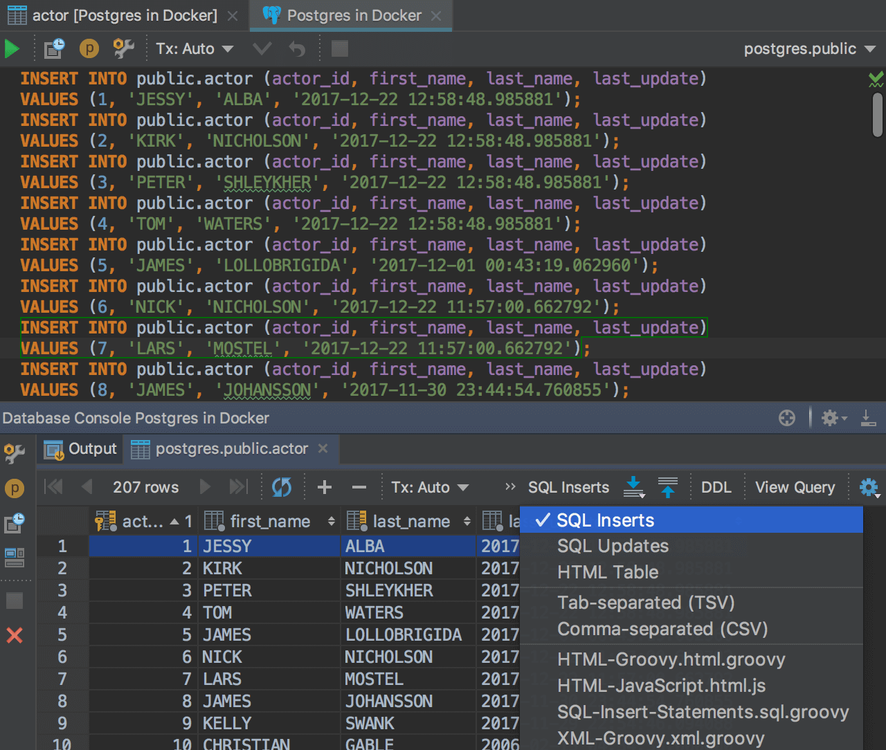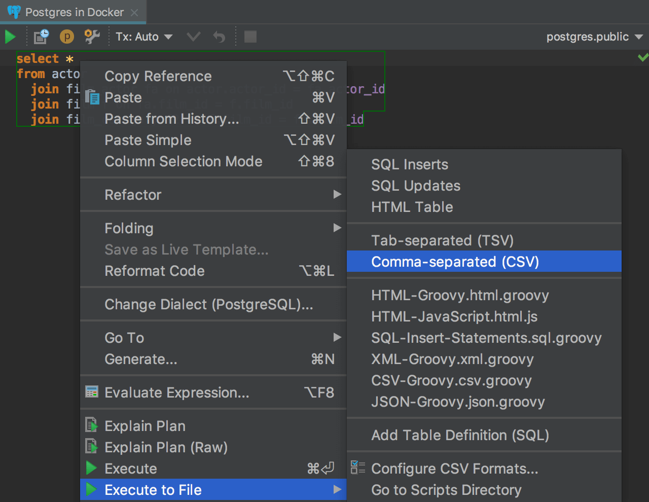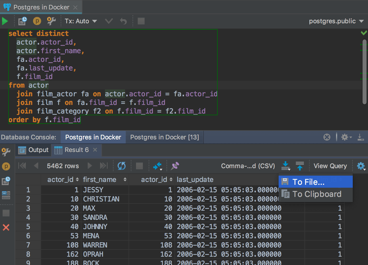 SQL 查询可以作为结果导出到文件中。 语句的上下文菜单 → 执行到文件 (Execute to file) → 选择格式。 如果查询比较慢,该功能很实用; 如果你导出结果集,查询将再次运行。 在这种情况下,您只需要运行一次。