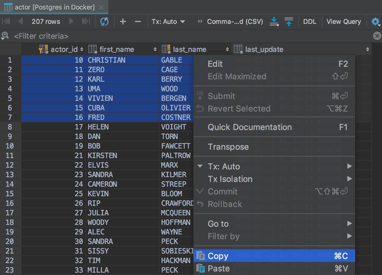 DataGrip 可以将 CSV 文件作为表进行编辑。 在上下文菜单中点击作为表编辑。