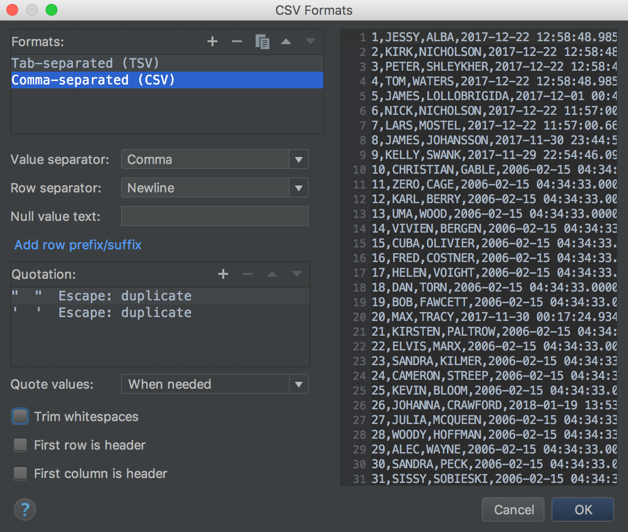 从 Excel 表中粘贴数据。 要执行该操作,通常您需要在 DSV 格式中粘贴数据的能力。 在 DataGrip 中,您可以定义任意您想要的 格式,或者您也可以让 IDE 自动侦测格式:齿轮图标 → 粘贴 格式: