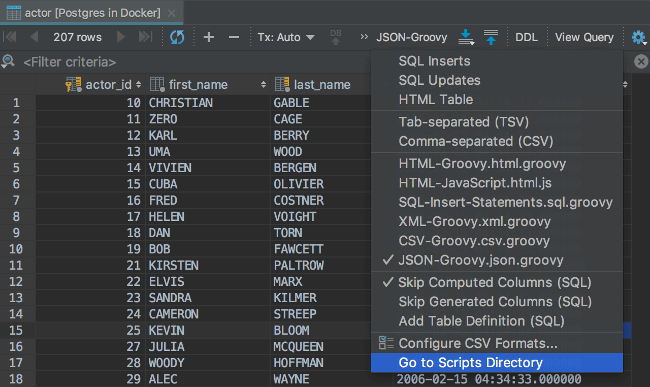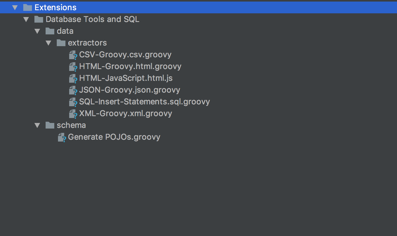 这些脚本是用 Groovy 编写的,但也可以用 JavaScript 编写,而且通常位于 Scratches 和 Consoles/Extensions/Database Tools and SQL/data/extractors 中。 修改已有提取工具或在这里添加您自己的提取工具。