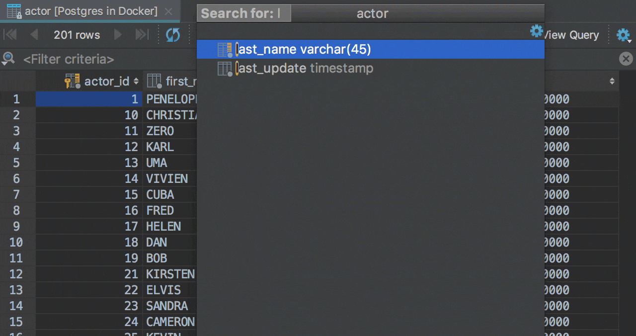 搜索任何结果集或表中的列时使用的小提示。 按下 Ctrl+F12 打开 结构视图 并开始输入! 快速搜索可以再次帮您节省时间并筛选列。 按下 Enter 转至特定的列。