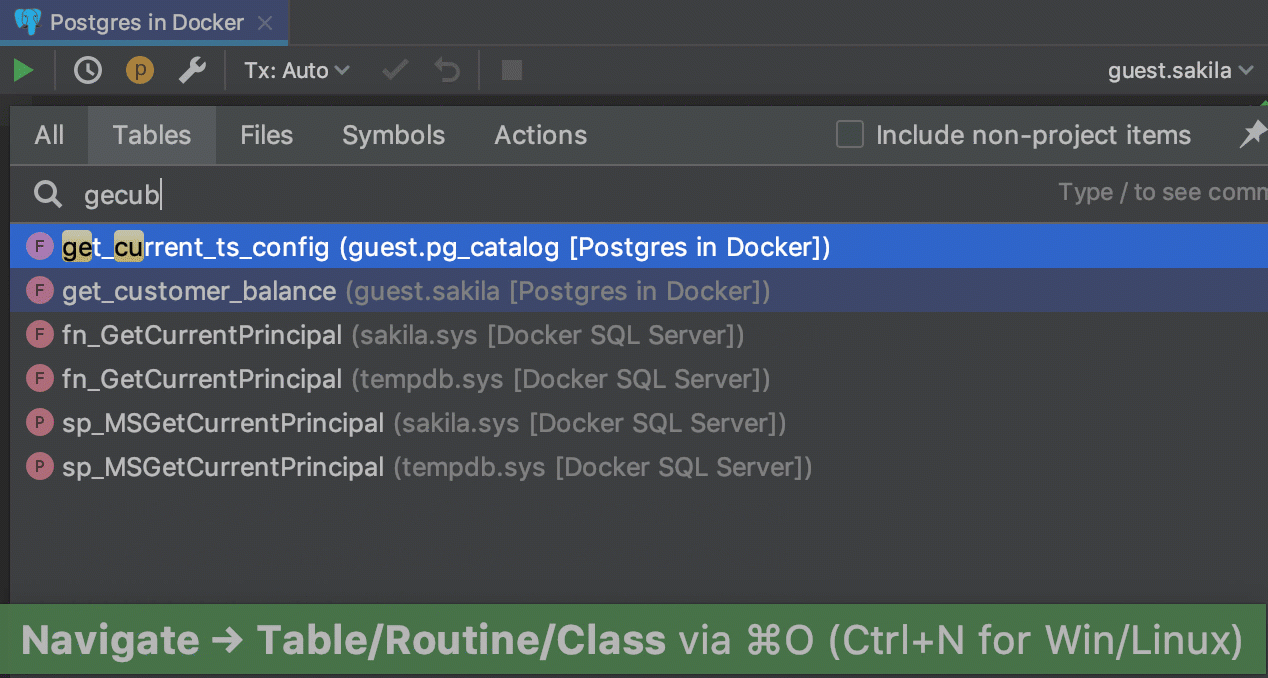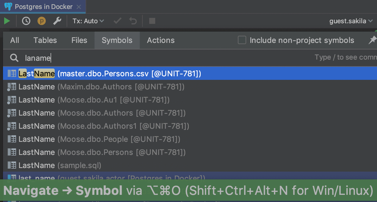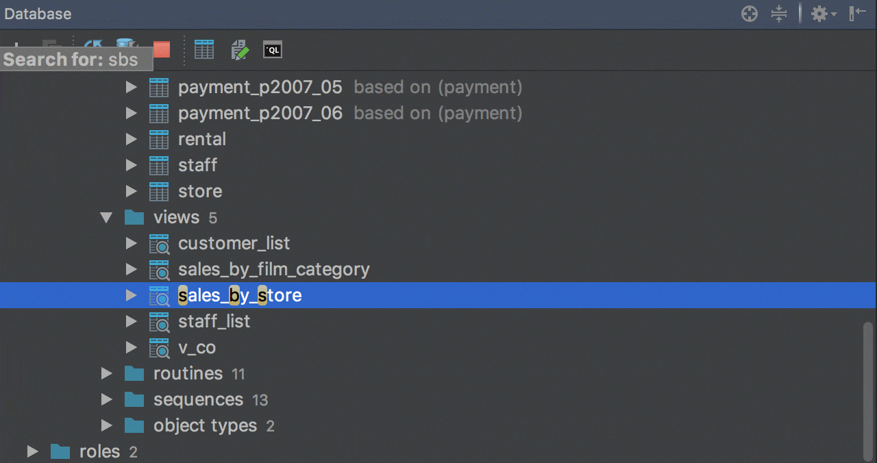 基于 IntelliJ 的 IDE 中的任何树(列表、弹出窗口、下拉菜单)都支持快速搜索。 开始输入吧! 请注意,匹配的数据库对象只有在其节点已打开时才会高亮显示。
