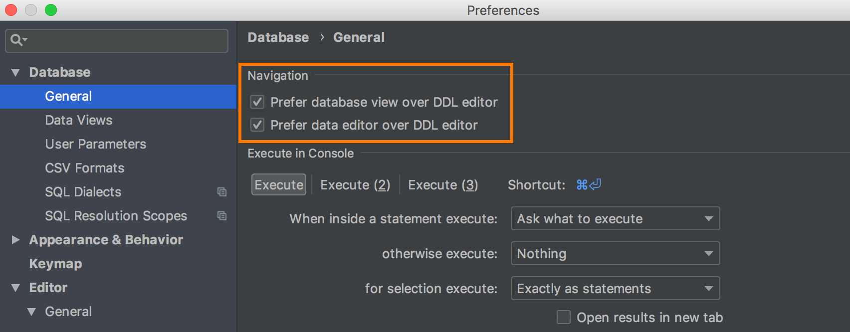 Prefer database view instead of DDL 定义了当您点击 Navigate to declaration(Ctrl+B 或 Ctrl+Click)时从 SQL 中跳转到的位置。