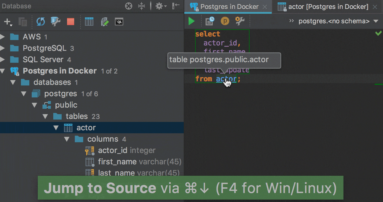 — Go to declaration (Ctrl+B) 可将您转至 DDL。 如果您希望此操作转至数据库树,请关闭 Settings → Database → General → Navigate references to DDL editor