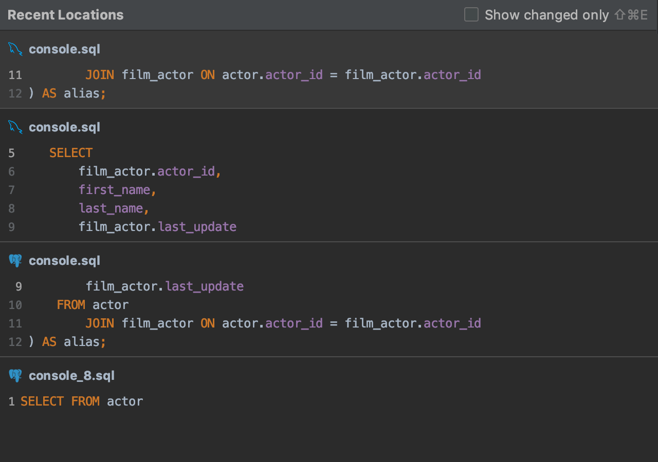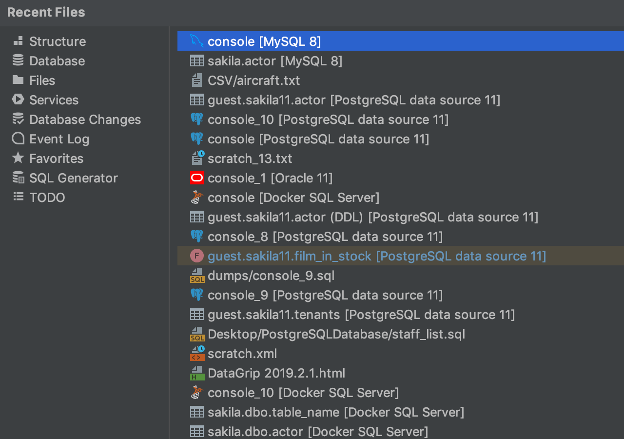 大多数情况下,您会需要在几个文件间快速切换。 这里真正节省时间的操作名为 Recent Files,通过按下 Ctrl+E 调用。 控制台、数据编辑器、文本文件:一切都在这里。 光标默认放在最后访问的项目。