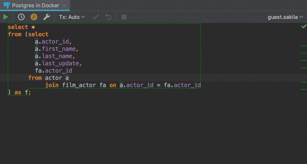 这是最重要的 SQL 重构之一。 准备好您的秒表,看看它能为您节省多少时间吧! 将脱字符号放到表名称上,然后按下 Alt+Enter → 引入表别名。