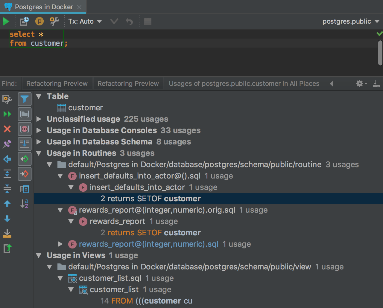 DataGrip 可以让您在其他对象的源代码里找到对象的用法。 比如,您可以了解有哪些存储的过程、函数或视图使用了您的表。 像平常一样,在表名称上按 Alt+F7 或通过上下文菜单调用。