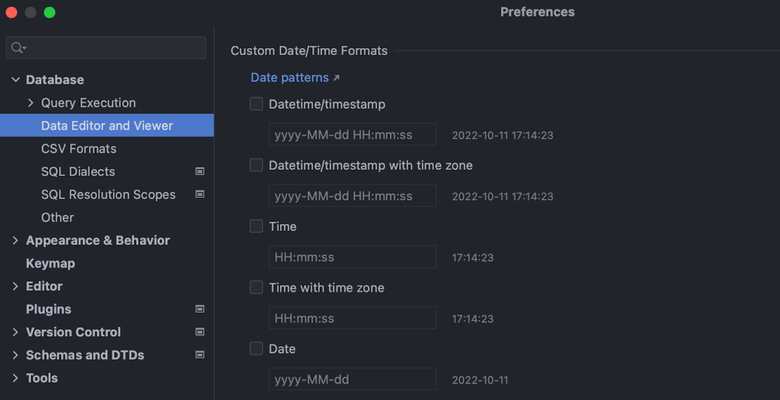 现在,可以自定义日期和时间类型的字段在数据编辑器中的显示方式。 设置位于 Database | Data Editor and Viewer(数据库 | 数据编辑器和查看器)中。