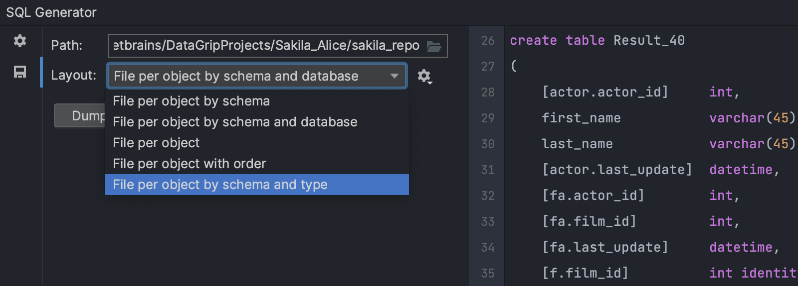 新布局称为 Per Object By Schema and Type。 为整个架构生成 SQL 时,生成的文件将根据对象的类型(表、视图等)放置在文件夹中。