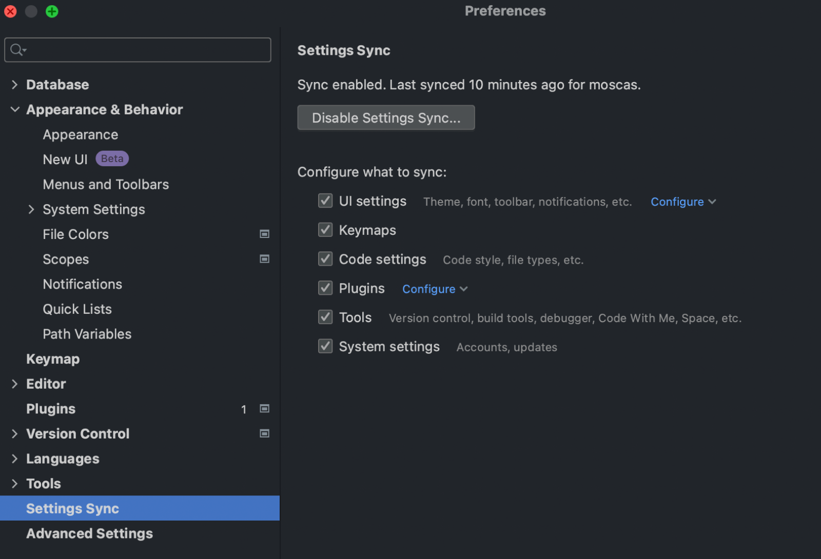 设置存储在附于 JetBrains 帐户的云端。 在同一 JetBrains 帐户下使用基于 IntelliJ 的不同 IDE 时,设置将自动同步。