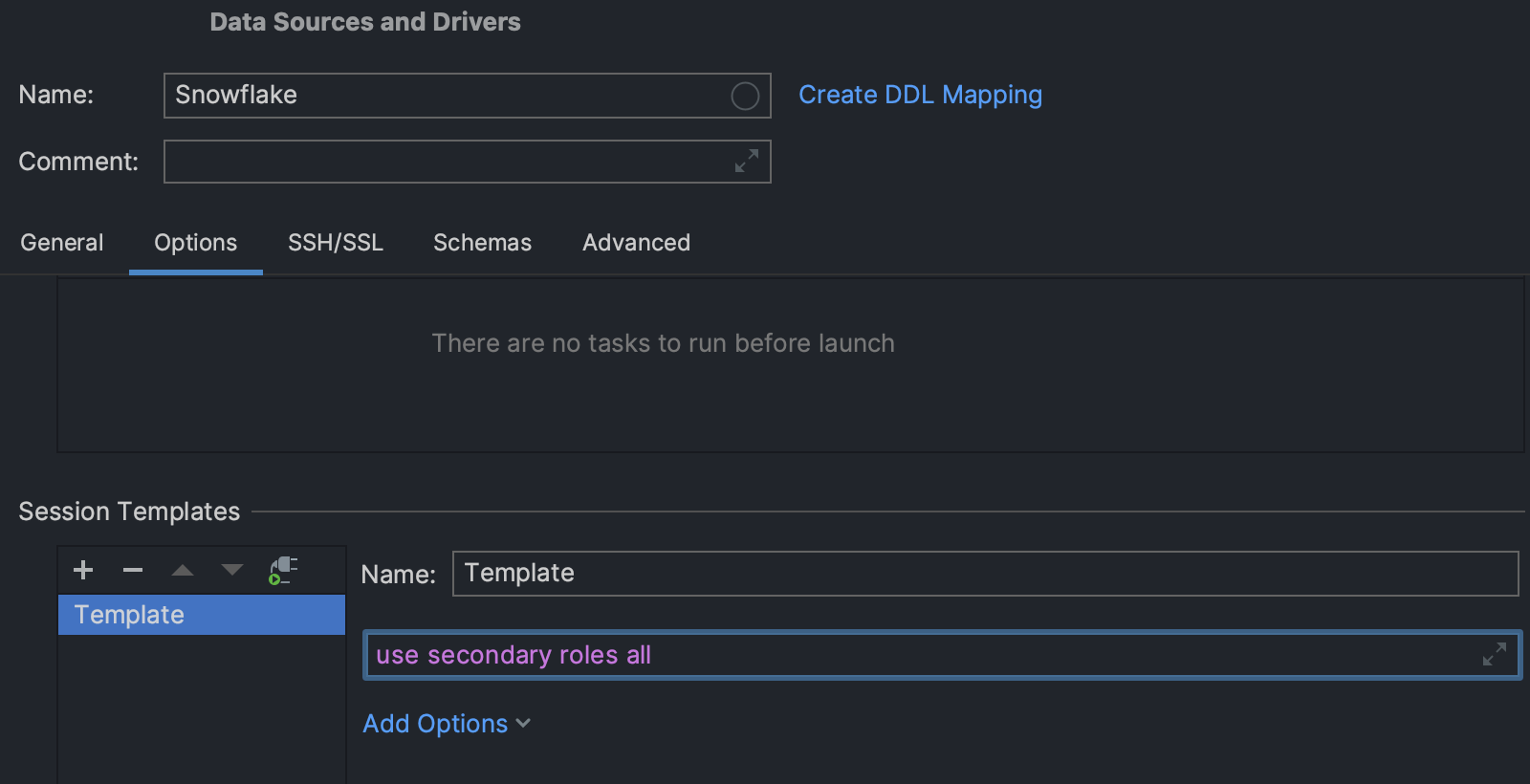 现在,可以为会话模板设置启动脚本。 这意味着每次基于相应模板创建新会话时都会运行该脚本。 例如,它让 DataGrip 运行 use secondary roles all 语句以在 Snowflake 中进行内省。