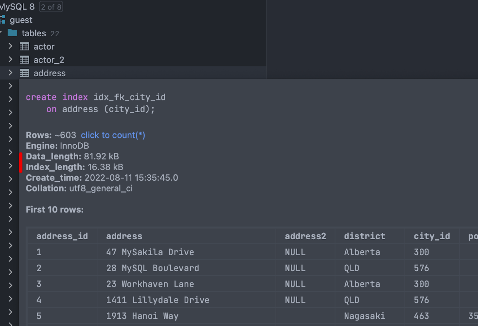 表的大小现在显示在 MySQL 和 PostgreSQL 的 Quick Documentation(快速文档)弹出窗口中。 点击 Show table preview(显示表预览)即可查看。