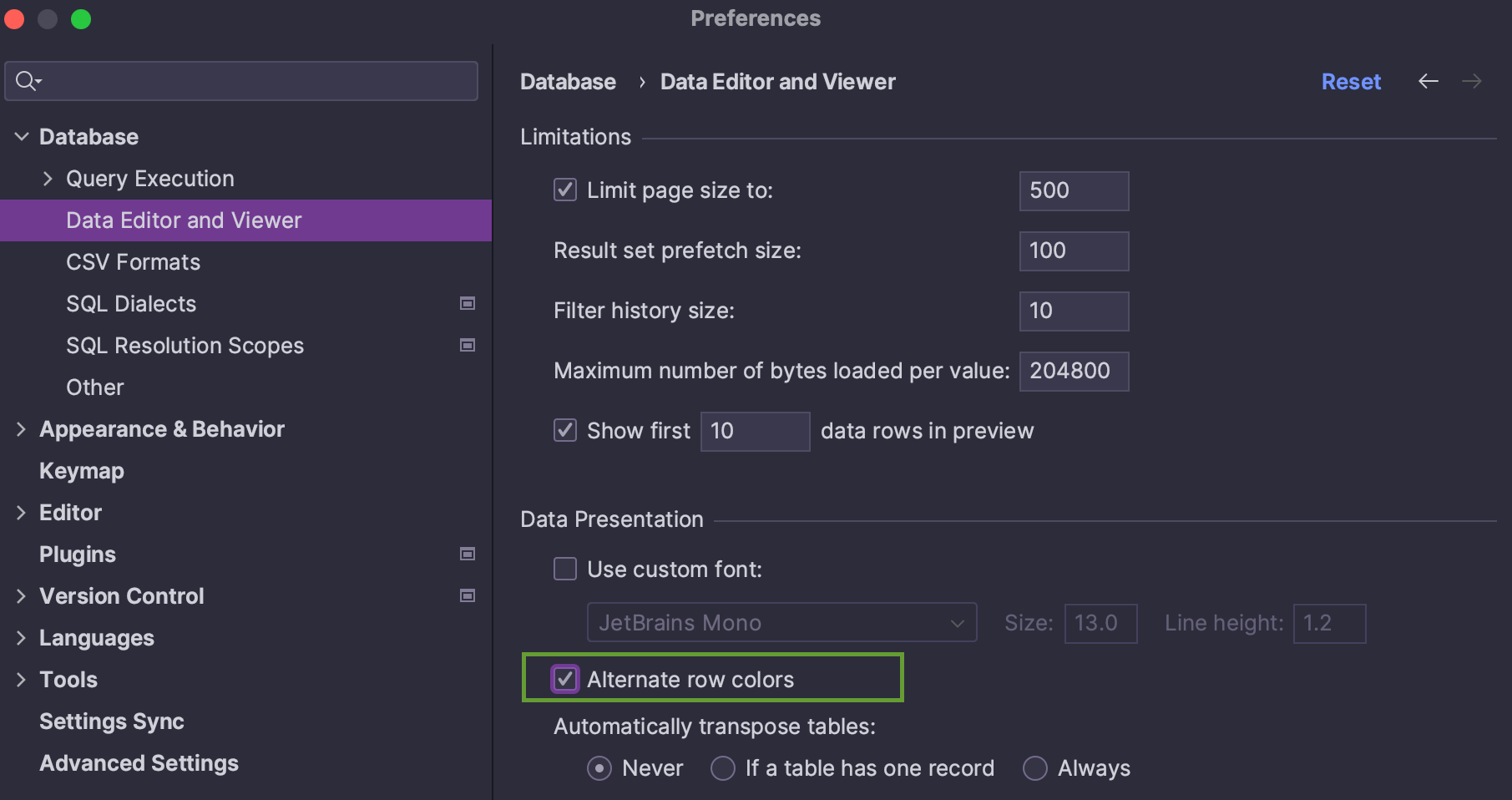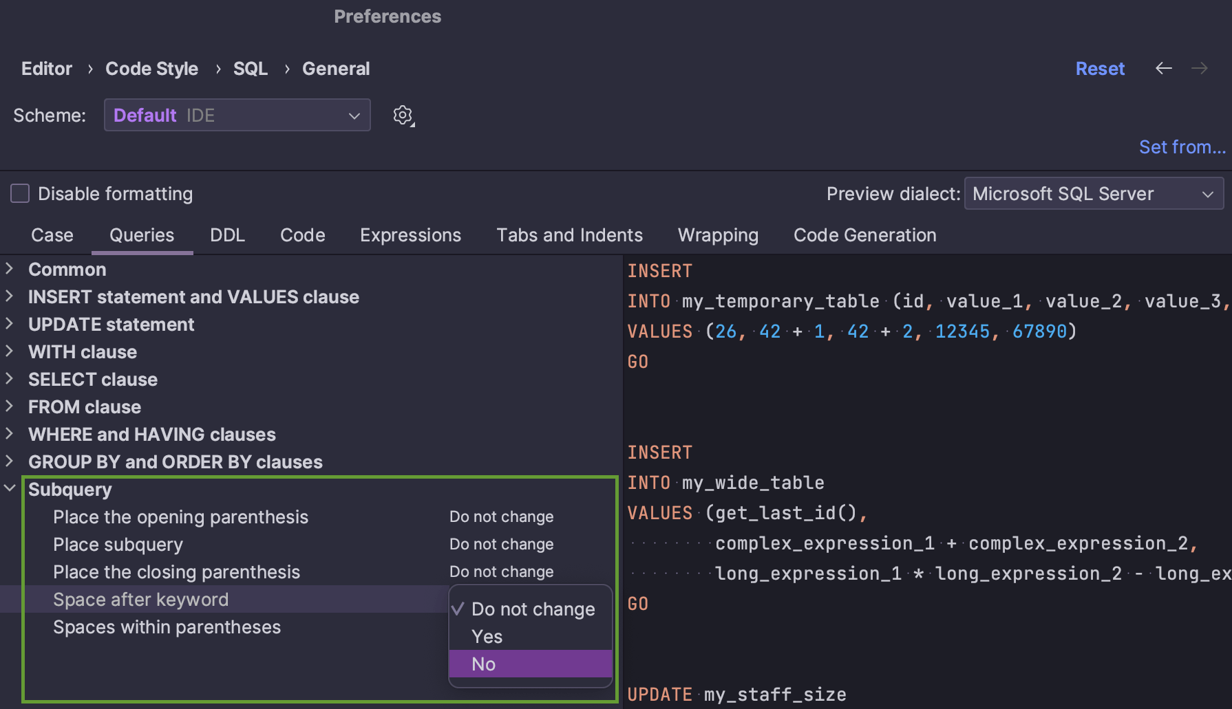 DataGrip 还可以在 EXISTS 关键字和左圆括号之间添加一个空格,可以通过新设置切换。 如需保留旧的 Formatter 行为(没有空格),您可以在 Preferences | Editor | Code Style | SQL(偏好设置 | 编辑器 | 代码样式 | SQL)(Queries(查询)标签页)中将 Space after keyword(关键字后的空格)设置更改为 No(否)。