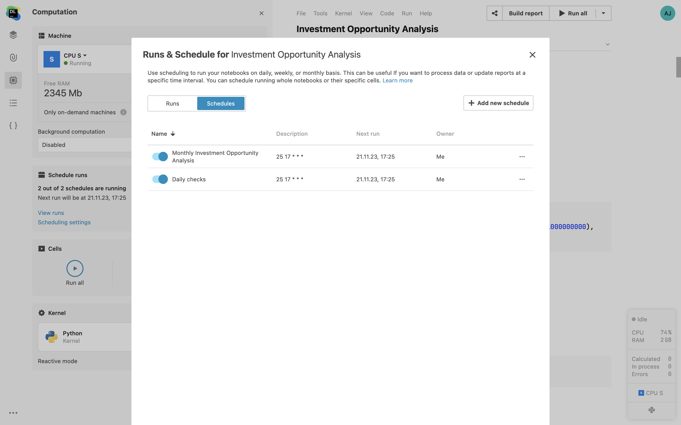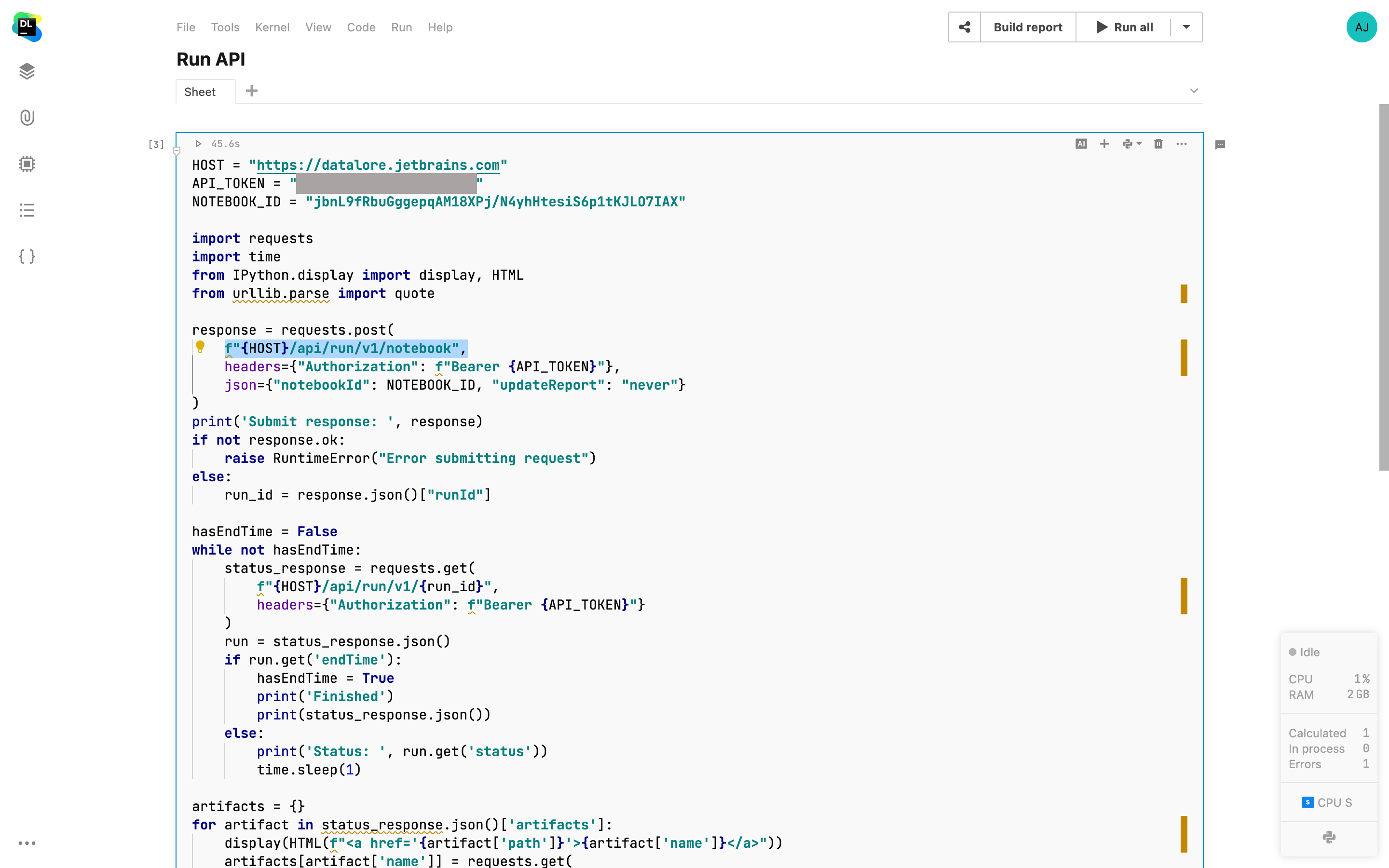现在可以通过 API 调用来触发运行 Datalore Notebook 或重新发布报告。 此功能可以补充定时运行,允许您从外部应用和内部 Datalore Notebook 按需触发重新运行 Notebook。 也可以从 Scheduled run(定时运行)菜单中查看运行结果。 在此处详细了解如何使用 API 。