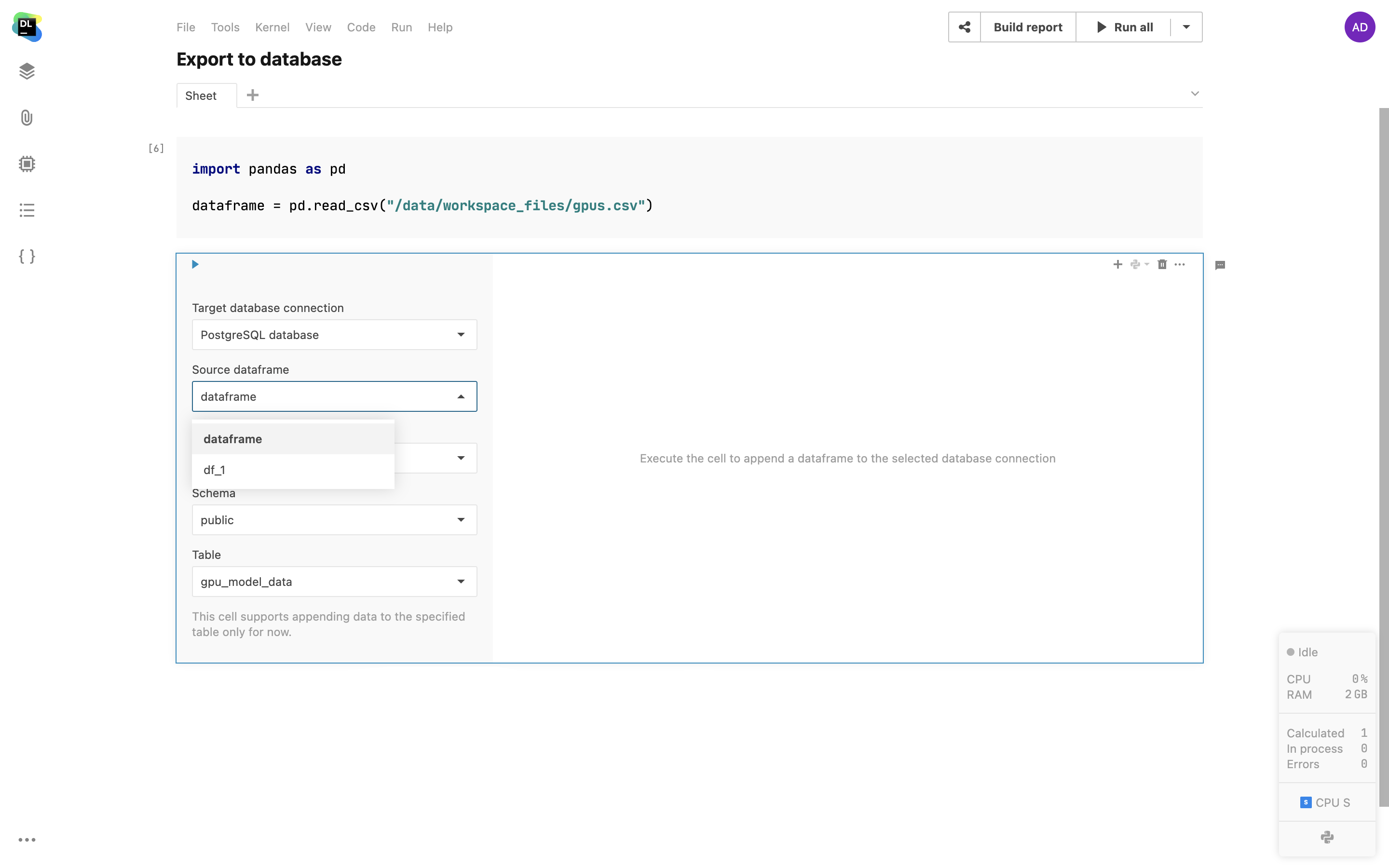 直接从 Notebook 将 DataFrame 导出到数据库中的现有表。 选择 DataFrame、目标数据库、架构和表来自定义导出。 此外,您还可以利用调度功能和自动执行导出。