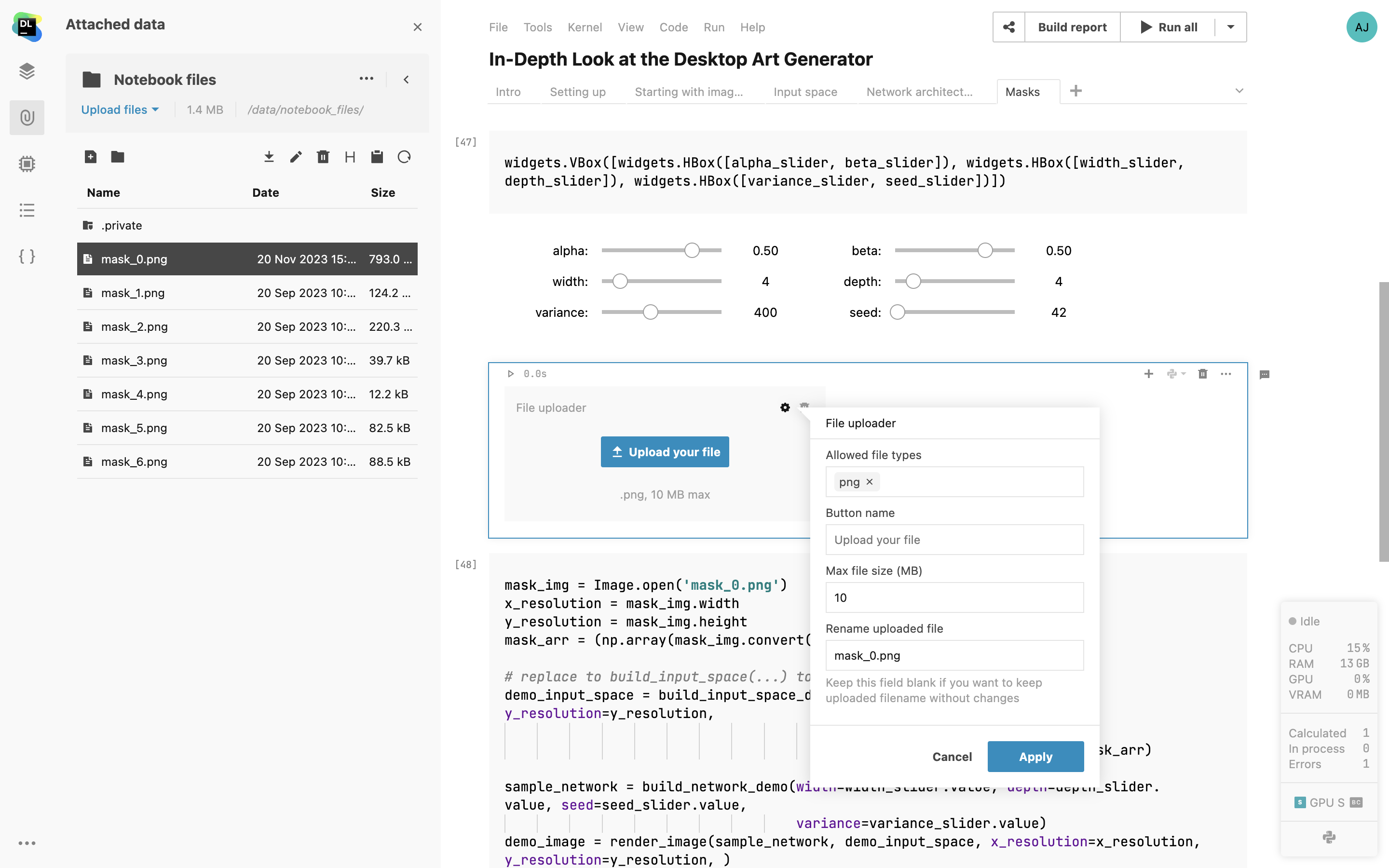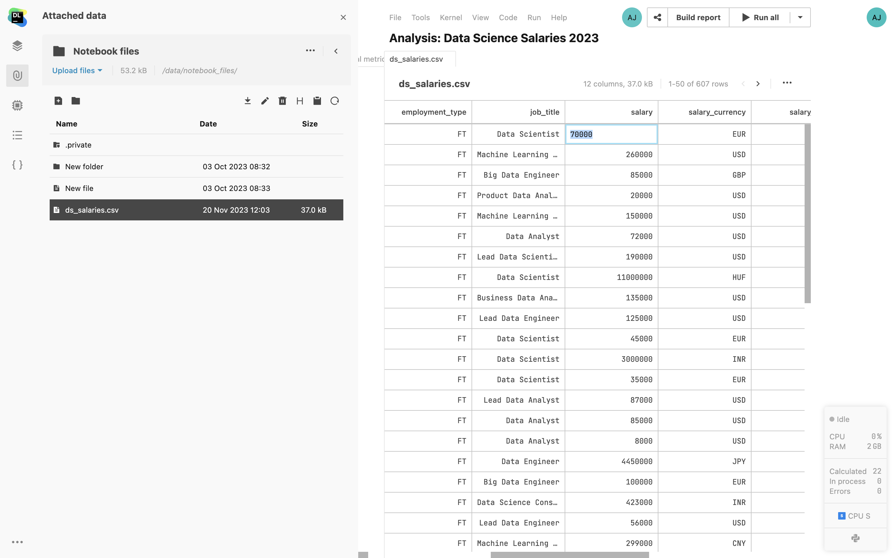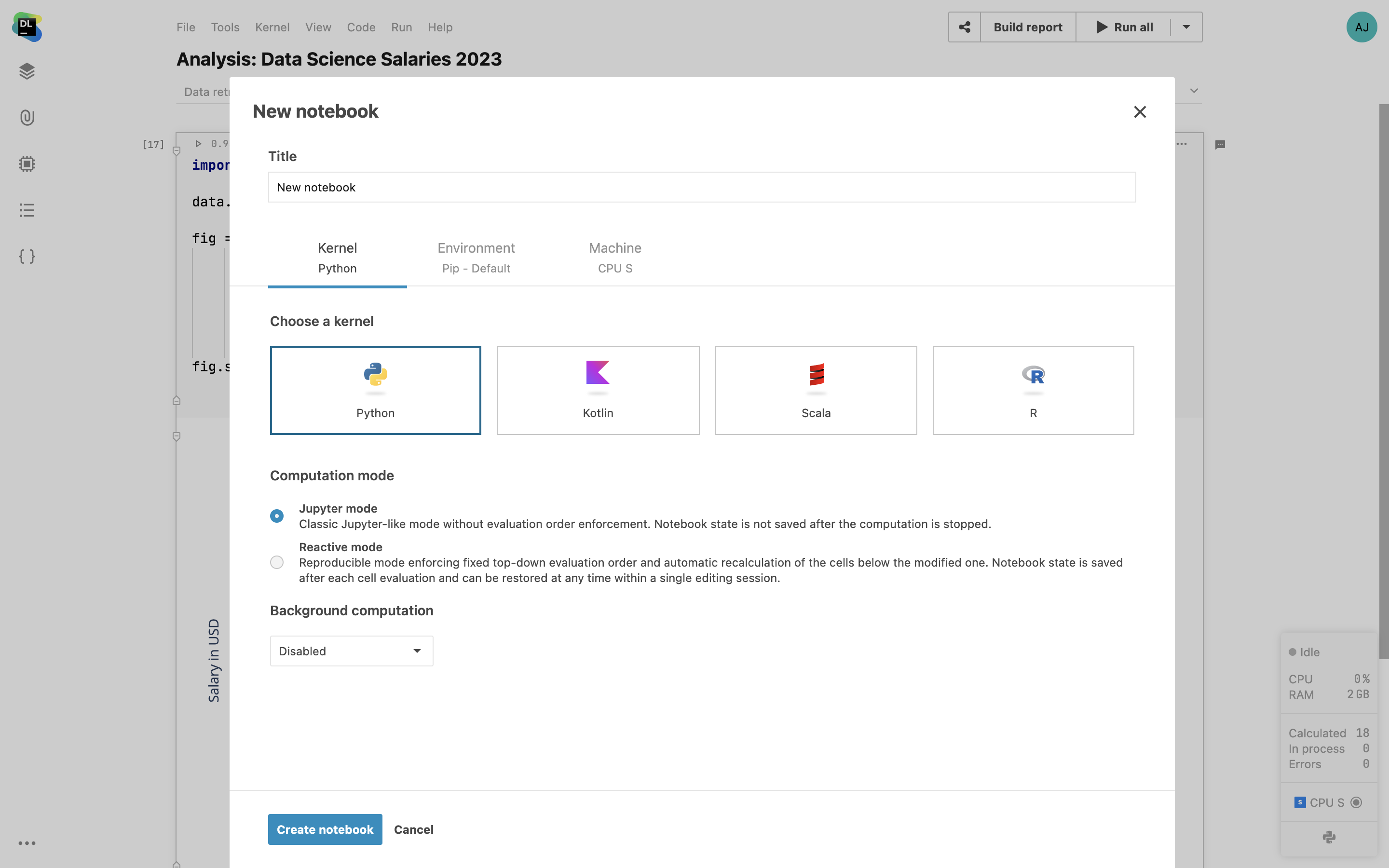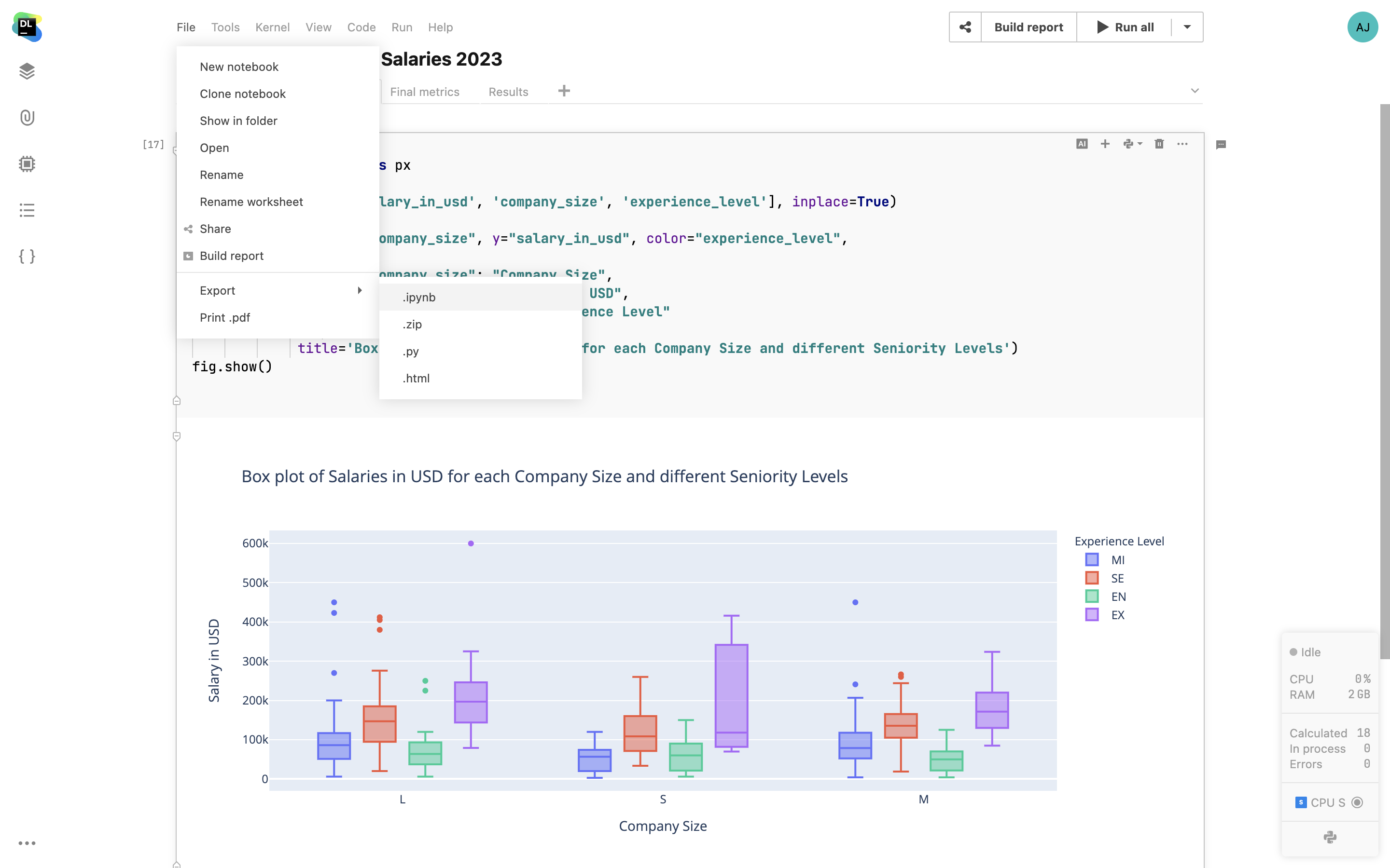 Datalore 中的 Notebook 与 Jupyter 兼容,这意味着您可以上传现有 IPYNB 文件并继续在 Datalore 中处理它们。 此外,您还可以将 Notebook 导出为 IPYNB 文件。 请注意,将不导出数据连接和交互式控件。