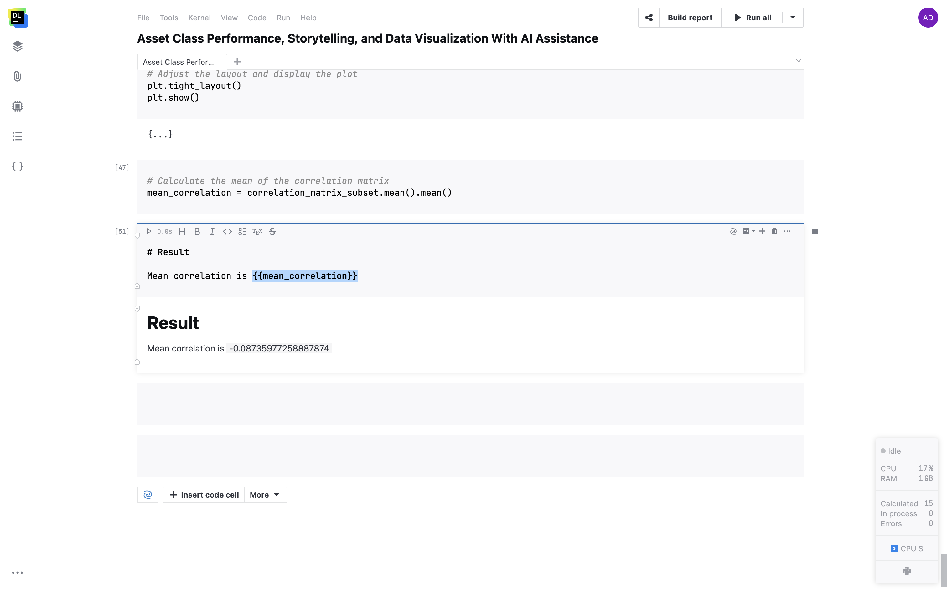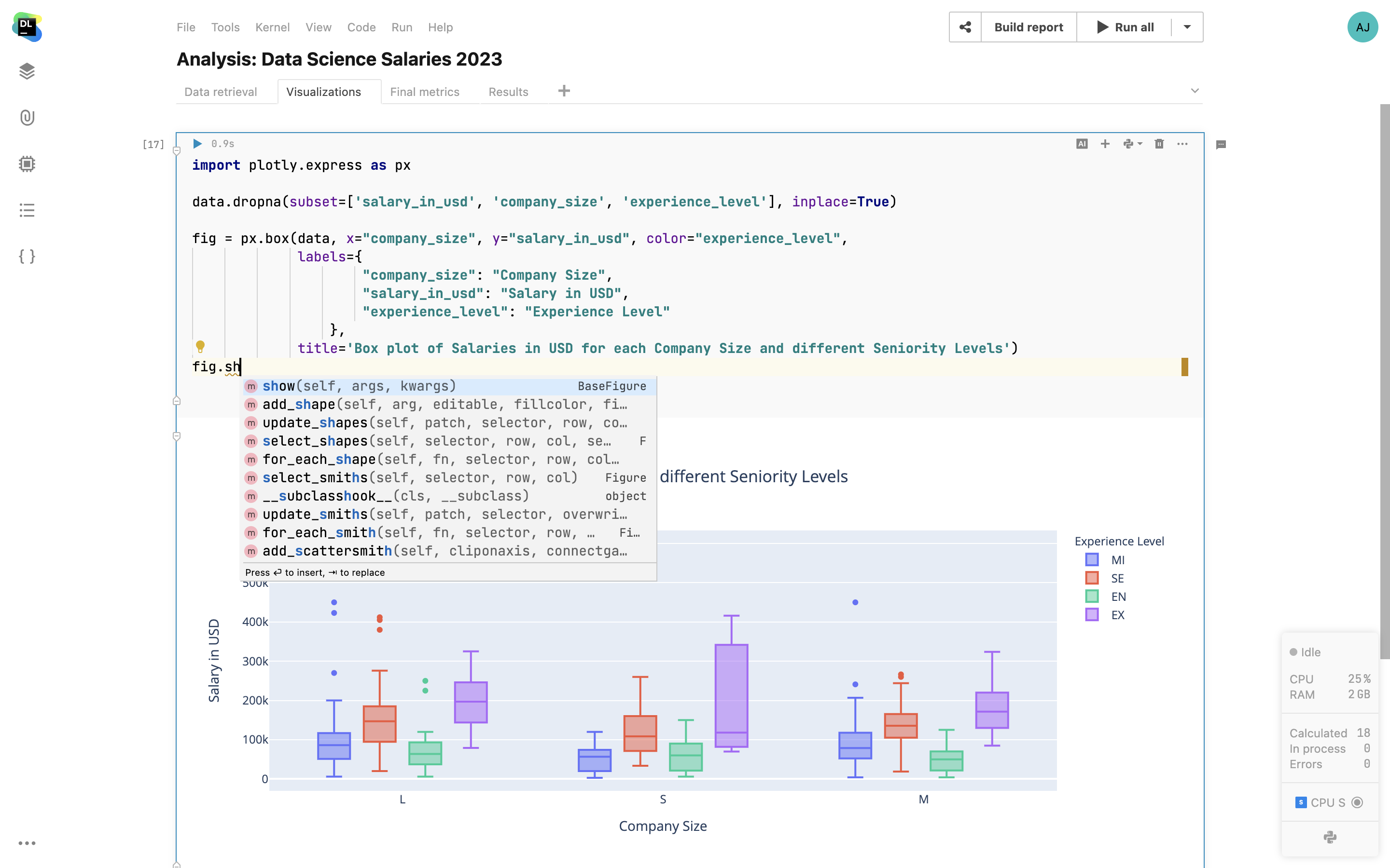使用您选择的软件包创建可视化效果。 Datalore Notebook 中支持 Matplotlib、plotly、altair、seaborn、lets-plot 和许多其他软件包。