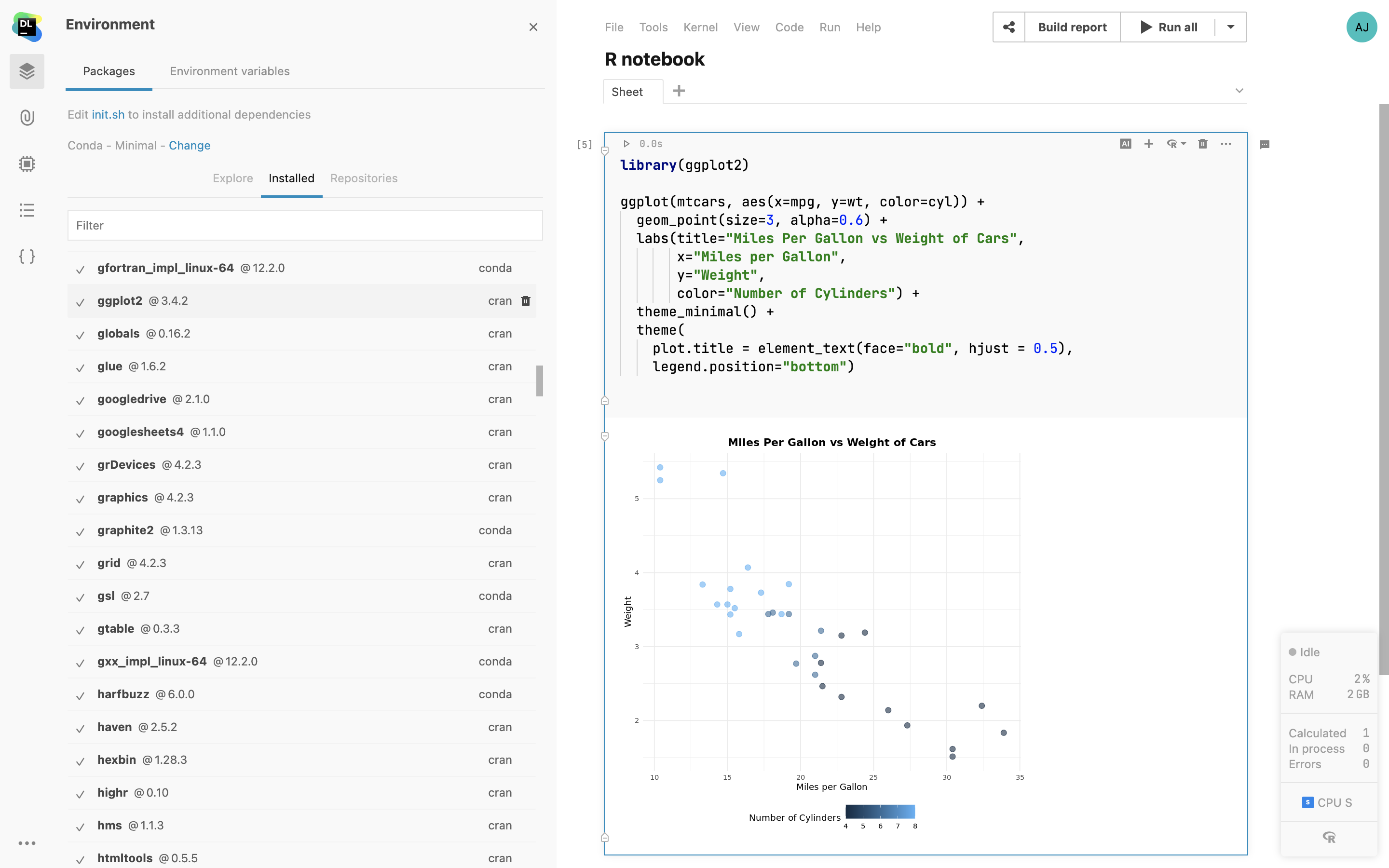 在 Datalore 中,您可以创建 Kotlin、Scala 和 R 笔记本。 您可以使用魔法命令安装软件包,在编写代码时,您将获得代码补全。
