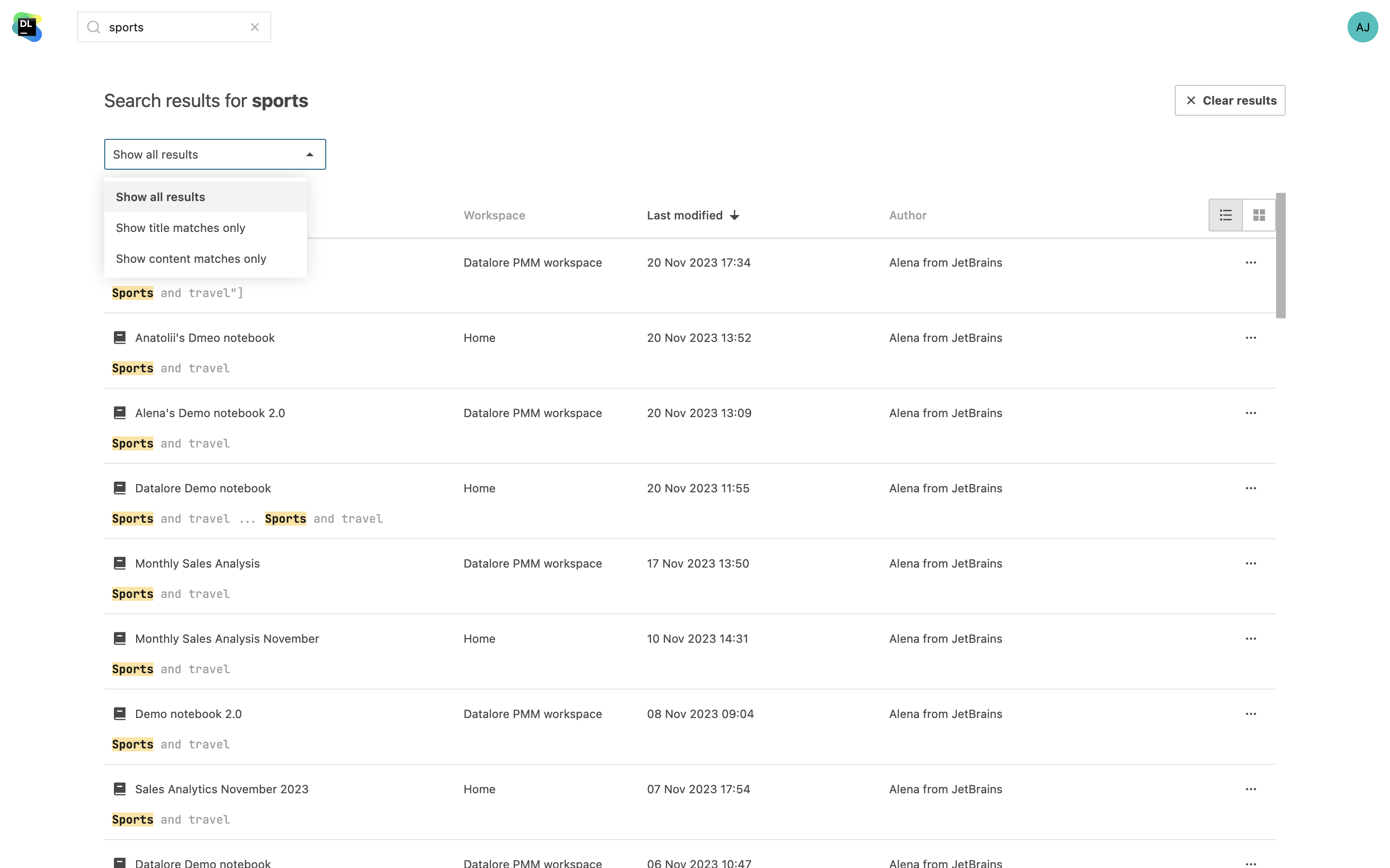 在工作区的所有 Notebook 中找到特定代码部分或查找必要信息。 除了搜索 Notebook 名称外,您现在还可以搜索变量名称和内容。 您将在搜索结果中看到高亮显示的查询。
