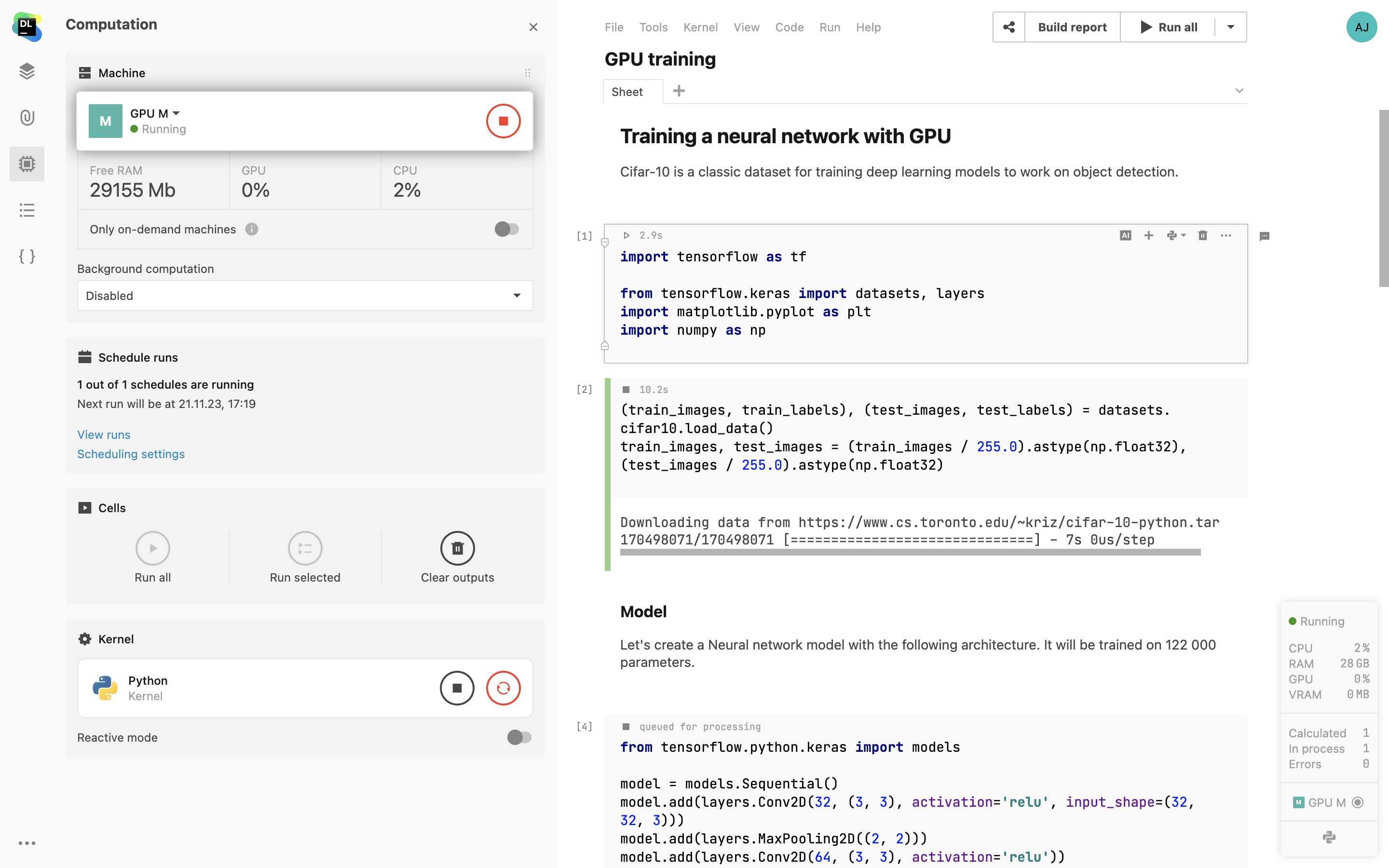 在 Datalore 中,您可以在 CPU 和 GPU 上执行您的 Notebook。 您可以从用户界面中选择所需的计算机。 您获得的资源类型和数量取决于您拥有的方案。 请在此处了解更多信息。
