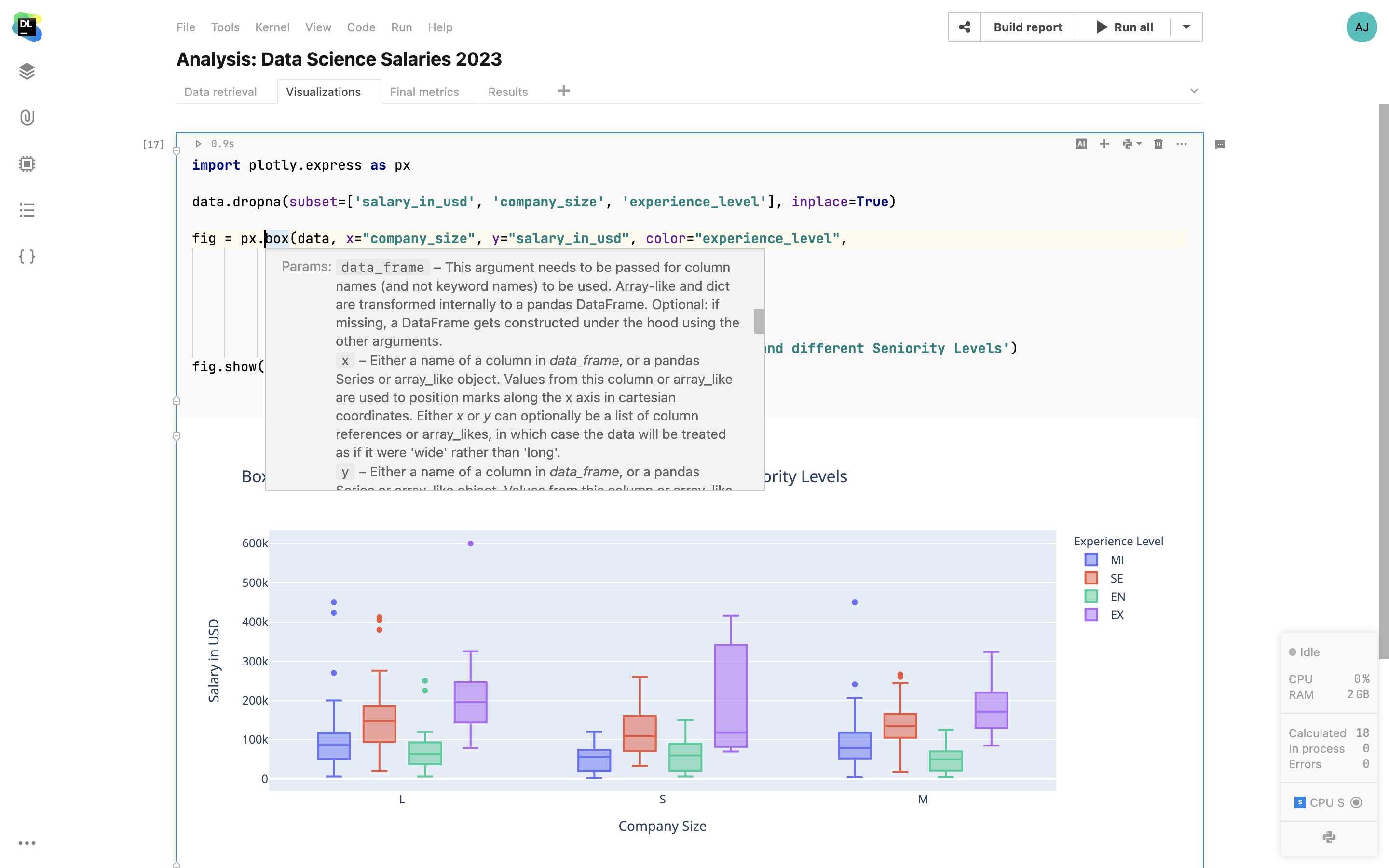 Datalore 与 PyCharm 的代码洞察功能捆绑在一起。 对于 Python Notebook,您可以获得一流的代码补全、形参信息、检查、快速修复和重构,帮助您轻松编写更优质的代码。