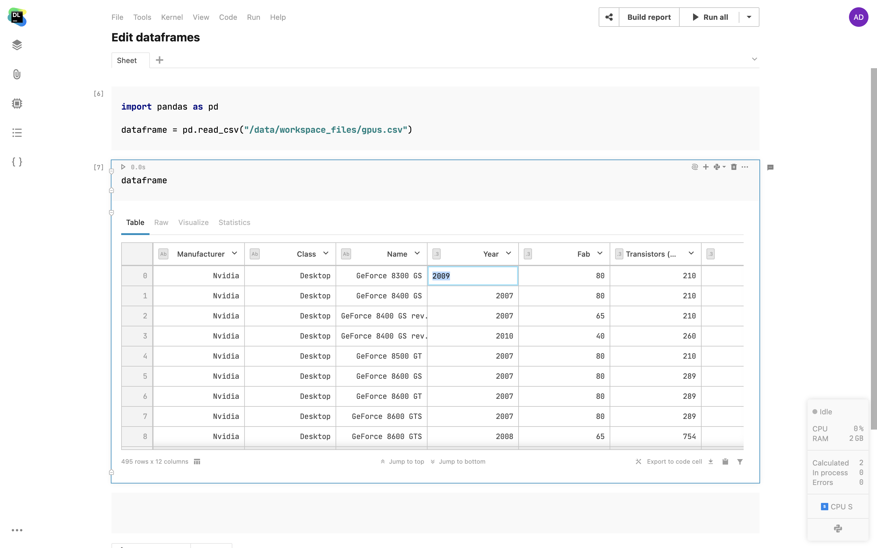 您不再需要下载 CSV 文件在 DataFrame 中进行一组编辑。 在交互式表内编辑单元内容,然后点击 Export to code(导出到代码)即可在 Notebook 中重现结果。