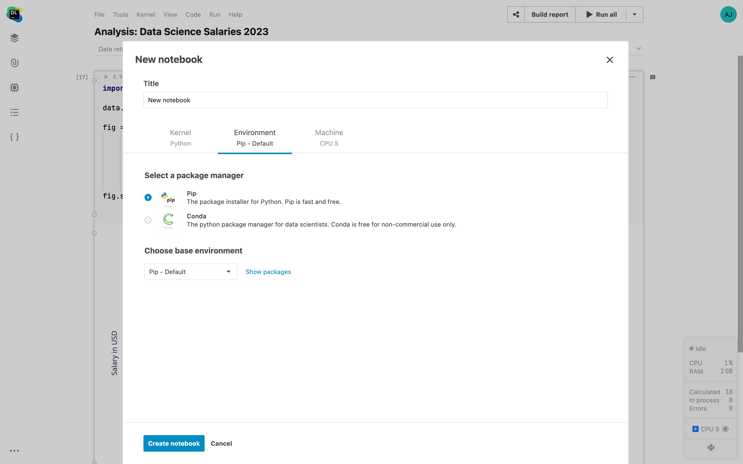 Datalore 支持 pip 和 conda。 Pip 速度快,而且对所有人免费,conda 则仅可免费用于非商业用途。