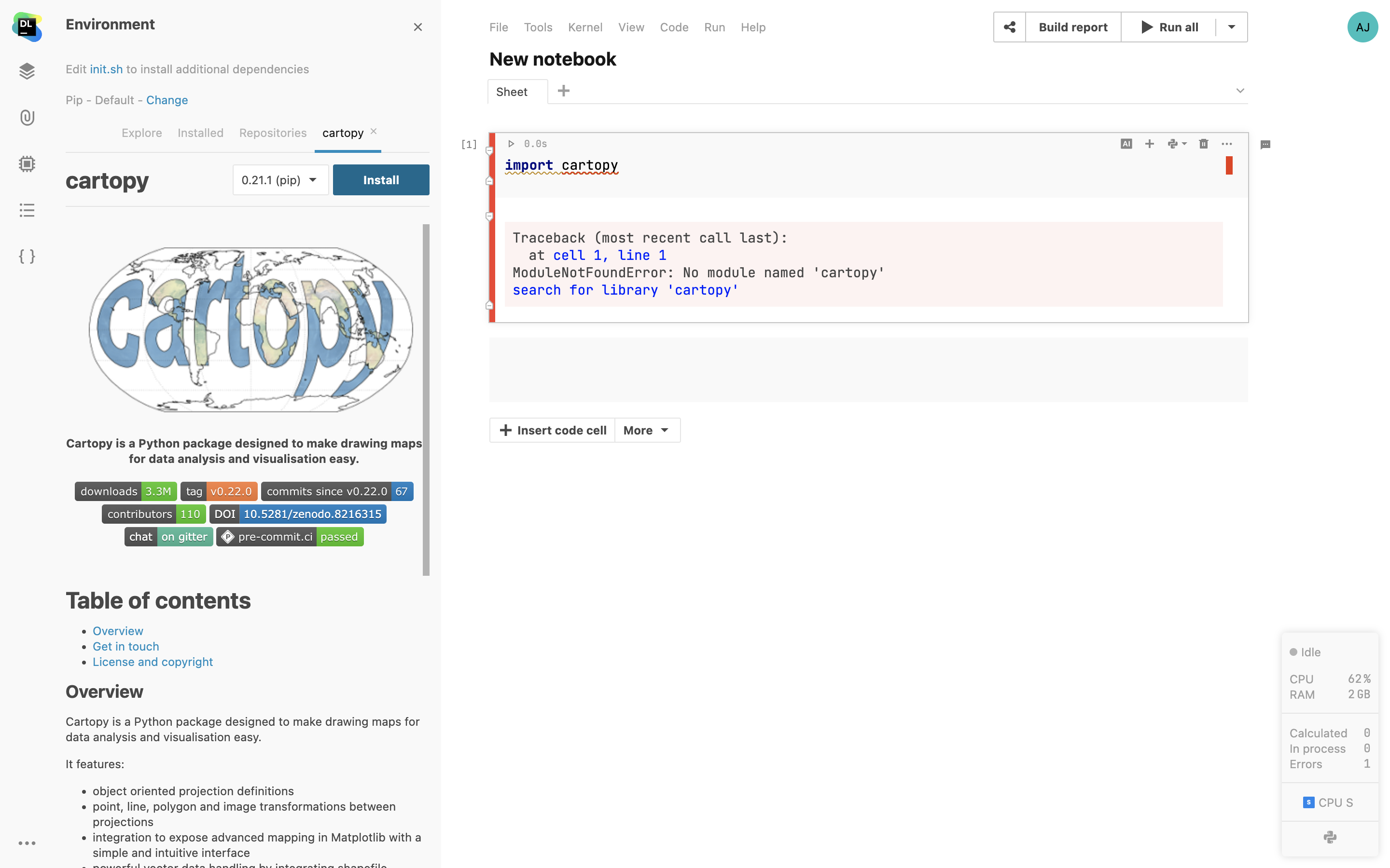 Datalore 附带一个集成软件包管理器,能够重现您的环境。 软件包管理器让您可以安装和管理新软件包,并确保在您重新打开 Notebook 时它们已进行预配置。