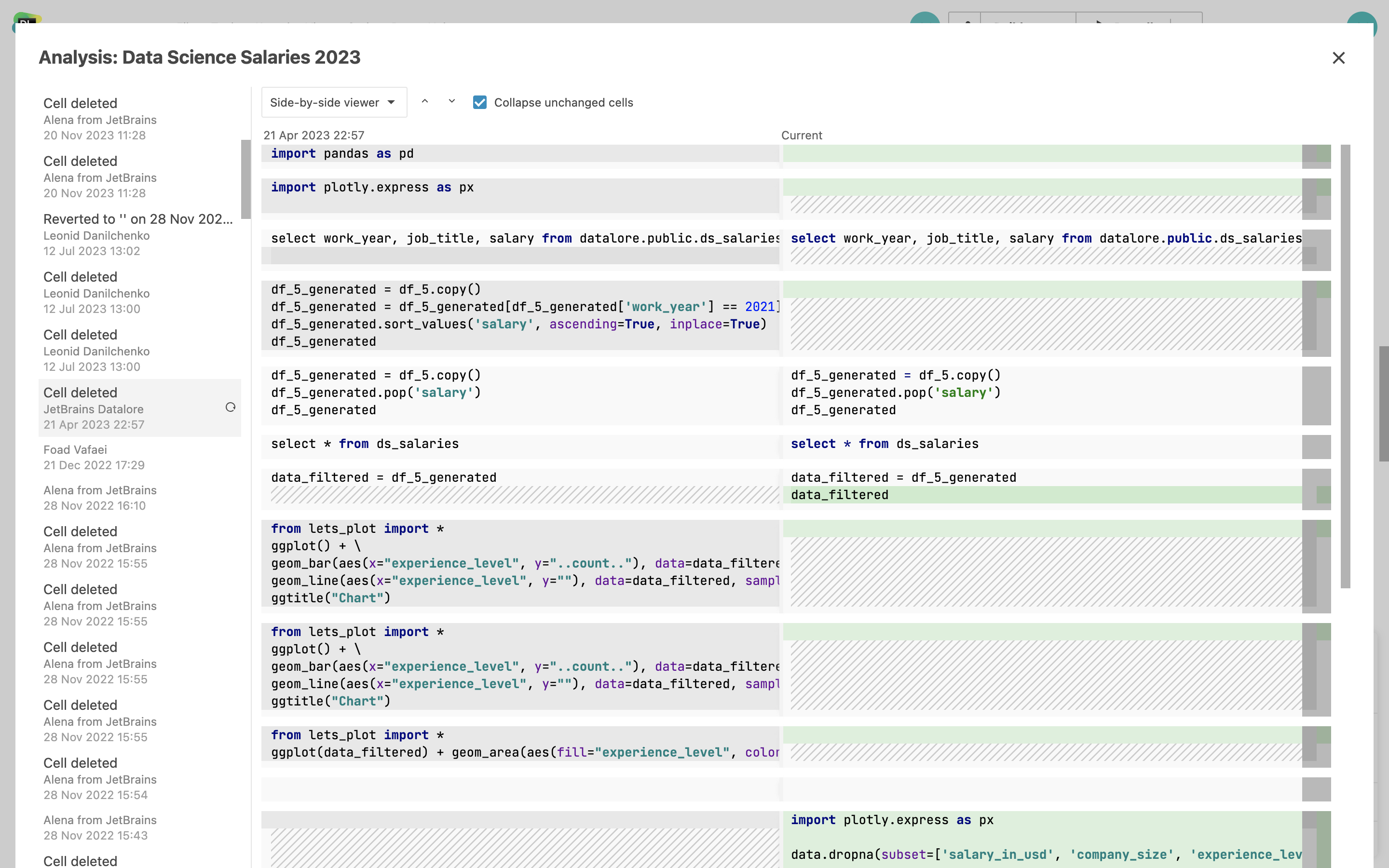 创建自定义历史记录检查点,让您随时可以使用历史记录工具恢复更改。 浏览检查点时,您将看到当前版本的 Notebook 与所选版本之间的区别。