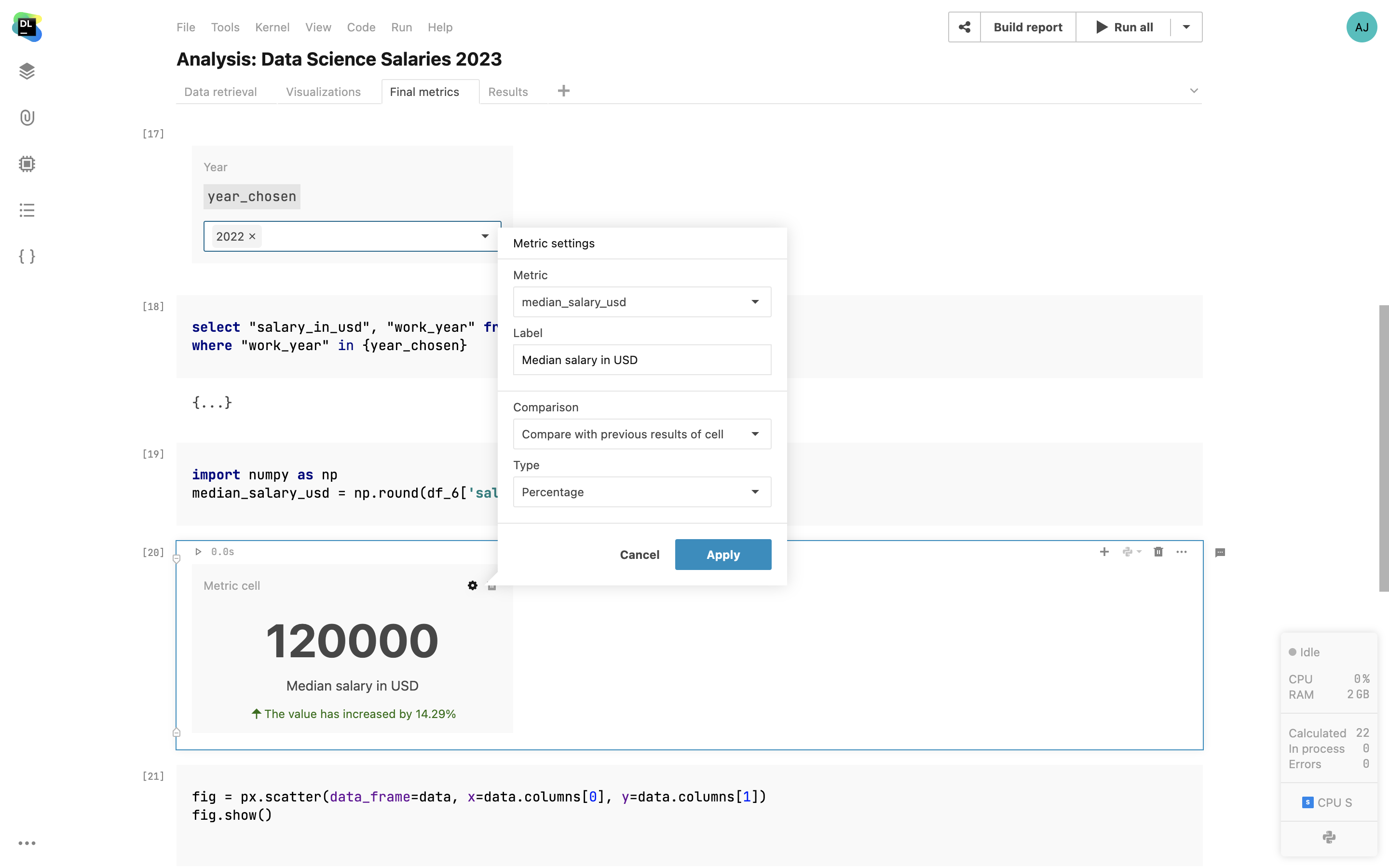 在 Notebook 中添加交互式输入,例如下拉菜单、滑块、文本输入和日期单元,并将输入值用作代码中的变量。 使用图表单元呈现可视化并高亮显示指标单元中的特定数字。