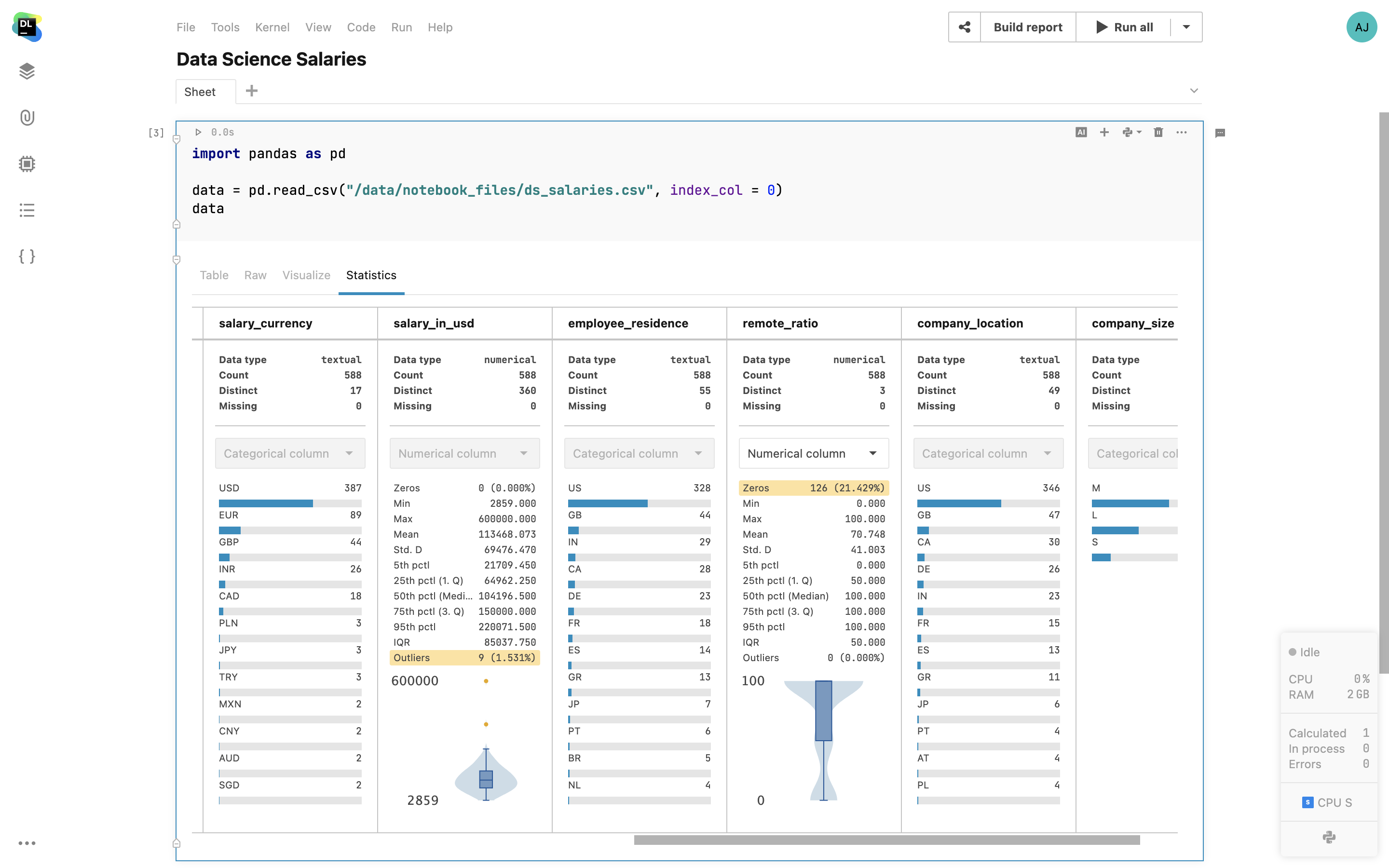 只需点击一下,您就可以在单独的 Statistics(统计信息)标签页中获得 DataFrame 的基本描述性统计信息。 对于分类列,您将看到值的分布,对于数值列,Datalore 将计算最小值、最大值、中值、标准差、百分位数,并高亮显示零值和异常值的百分比。
