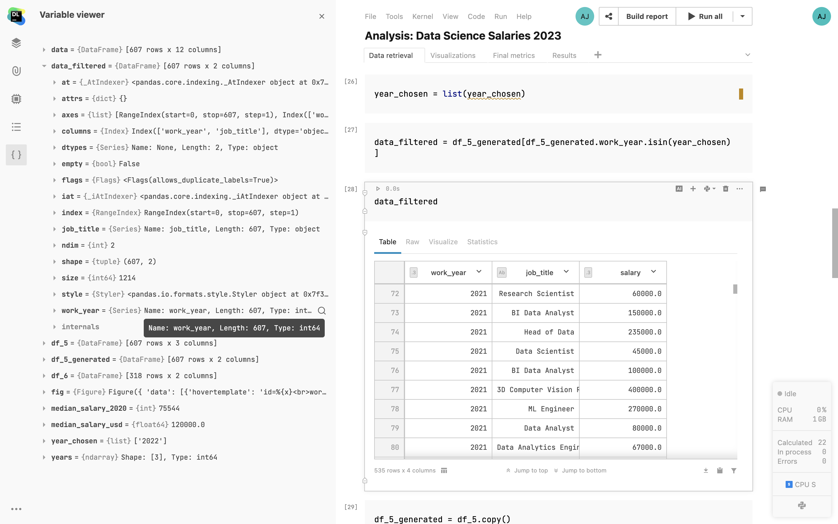 任何数据科学项目的核心都是 Jupyter Notebook。 Datalore 提供了使用 Jupyter Notebook 的智能工具。 依靠其对 Python、SQL、R、Scala 和 Kotlin 的智能编码辅助,更快移动并更轻松地编写更高质量的代码。 Datalore 编辑器可以快速访问所有基本工具,包括附加的数据源、自动可视化、数据集统计、报告构建器、环境管理器、版本控制等。