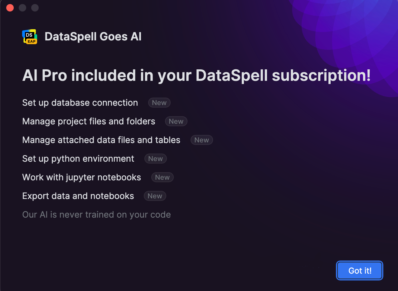 在 2025.2 版本发布后,DataSpell 作为 JetBrains for Data 系列中的 AI 优先数据分析环境开辟了新的发展方向。 从这个版本开始,DataSpell 在每个付费订阅的产品中都免费包含 JetBrains AI Pro,这体现了我们将 AI 引入数据产品的承诺。 但请注意,包含的 AI Pro 订阅只能在 DataSpell 中使用。