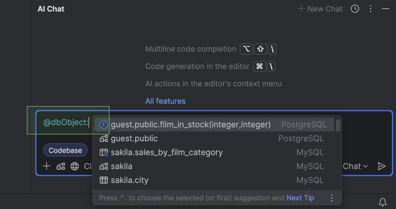 您向 AI 聊天提供的数据库上下文现在可以更加具体。 以前,只能附加整个架构。 现在,您可以附加需要处理的数据库对象,例如表或视图。 这在使用较大的架构时尤其有用。