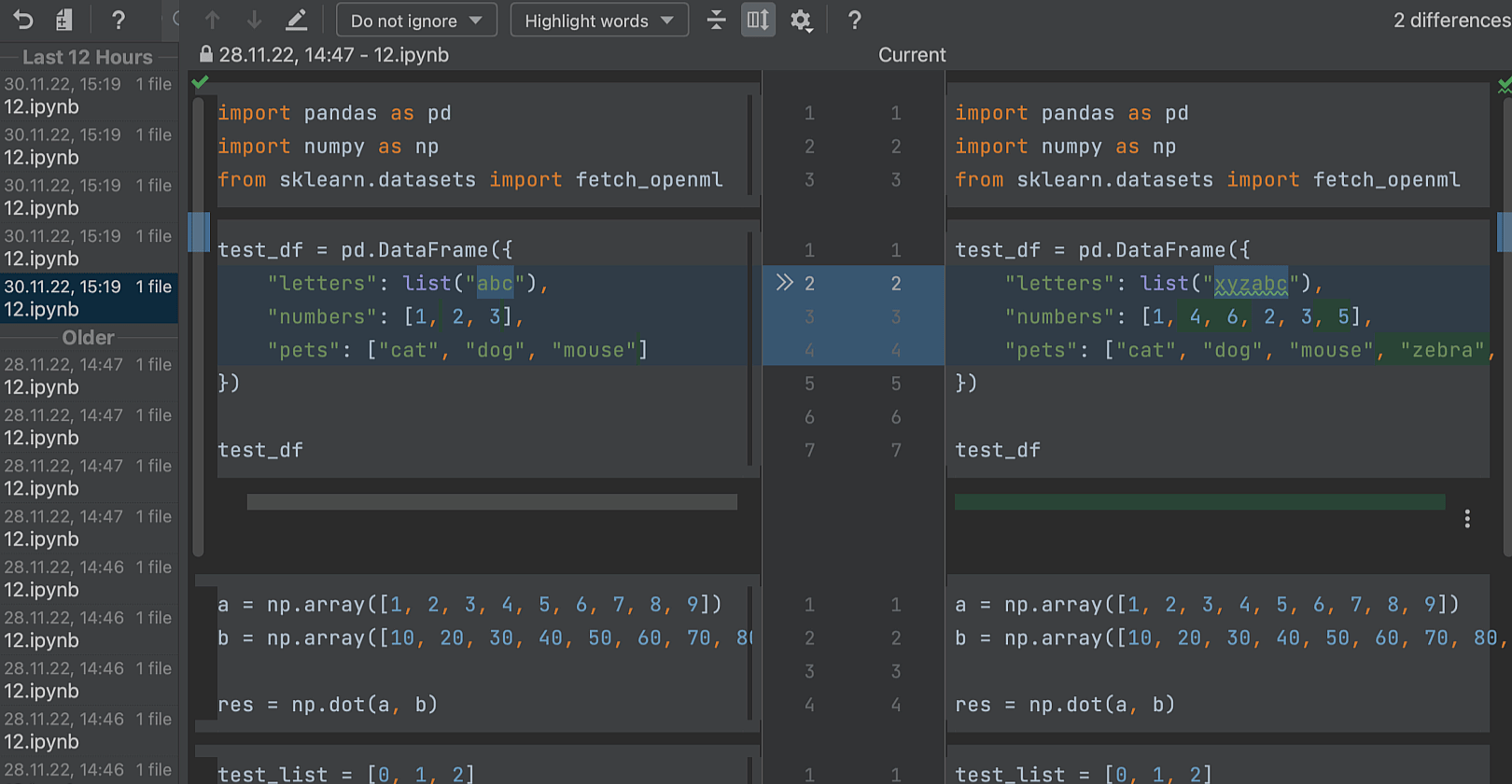 对当前文件有意义的更改独立于版本控制自动跟踪。 这些更改作为检查点存储在 Local History(本地历史记录)中,可供轻松查看和还原到先前的状态。 检查点之间的差异可以使用完全呈现的 Jupyter Notebook 进行比较。