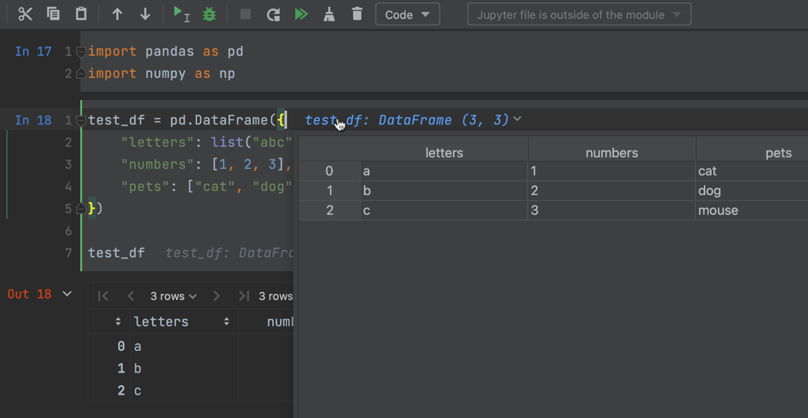 借助 Data Vision,您可以在 Notebook 中检查 Jupyter 变量。 启用此功能可以提供许多重要变量类型的实用内联信息,例如 NumPy 数组和 pandas DataFrame 的大小和内容。 转到 Settings/Preferences | Languages & Frameworks | Jupyter(设置/偏好设置 | 语言和框架 | Jupyter)并选择 Show inline values in editor(在编辑器中显示内联值)可以打开 Data Vision。 目前,内联信息仅在 Jupyter Variables 工具窗口打开时可用。