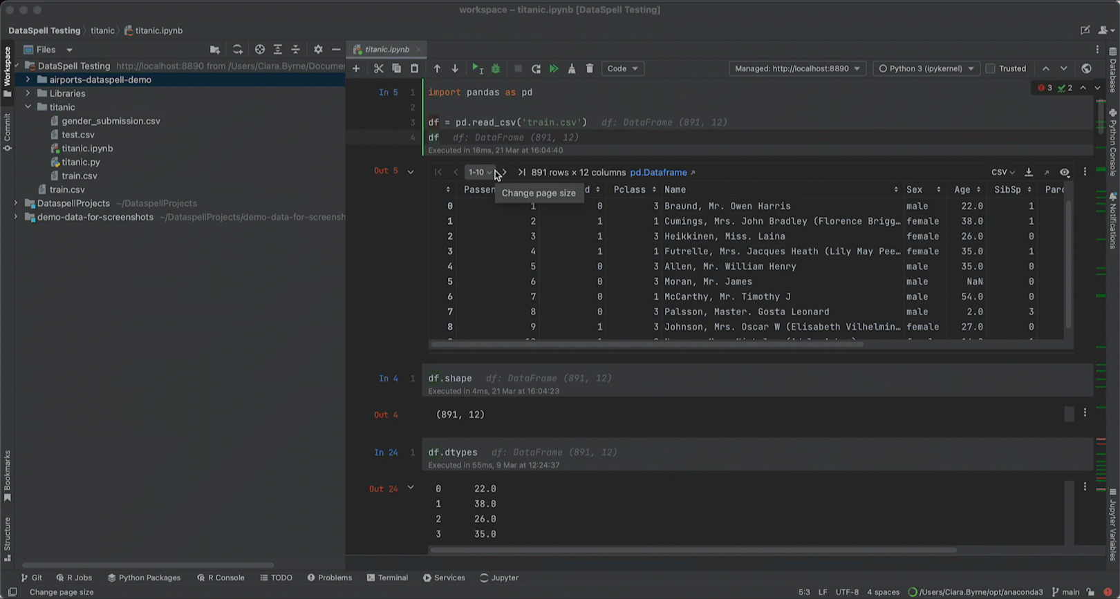 DataSpell 以表格形式显示 pandas DataFrame 的内容。 为了更舒适地浏览大型 DataFrame 表,请使用 Change Default(更改默认值)对话框将每页显示的行数更新为您喜欢的页面大小。